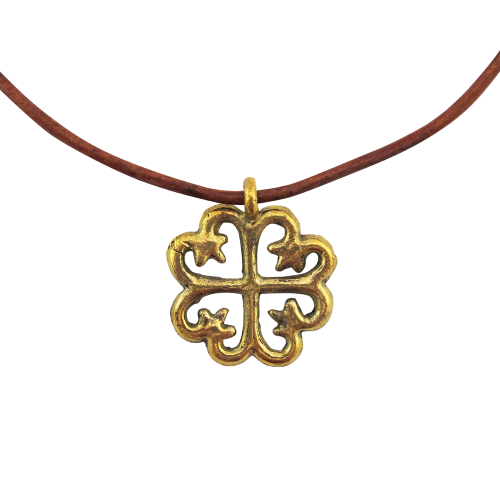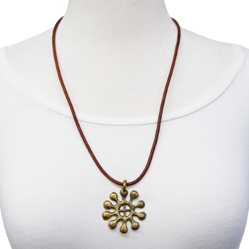 This striking necklace reflects the cultural traditions of Ghana, where adinkra symbols convey messages about life and relationships. Cast in brass by hand, each evocative pendant has a golden glow and unique identity.