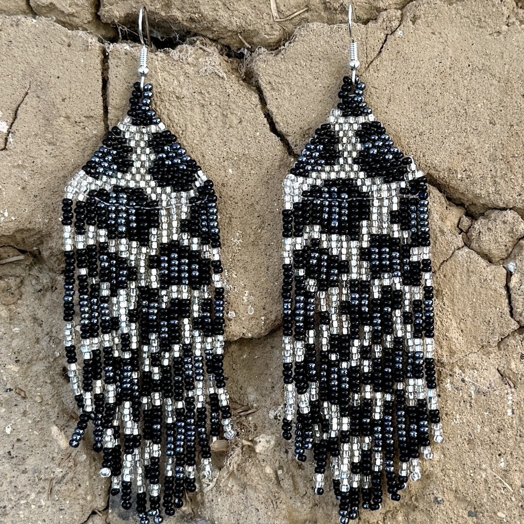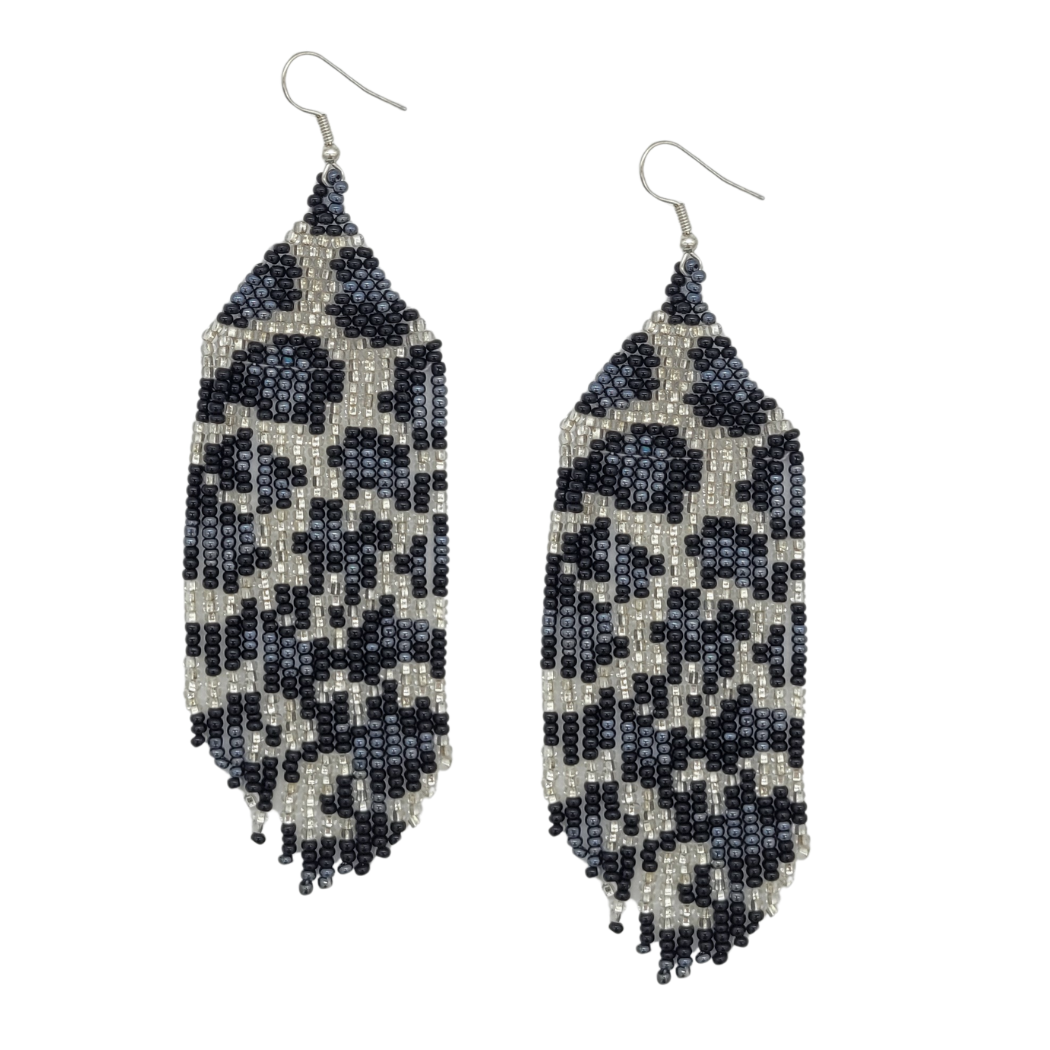 Unleash your animal side with these extra-wide earrings, each of which boasts 15 beaded strands. Made from scores of sparkling seed beads, they mimic the spots on a leopard or snow leopard.