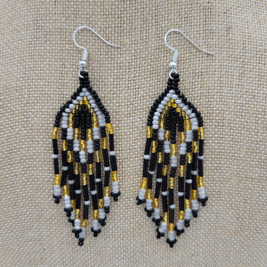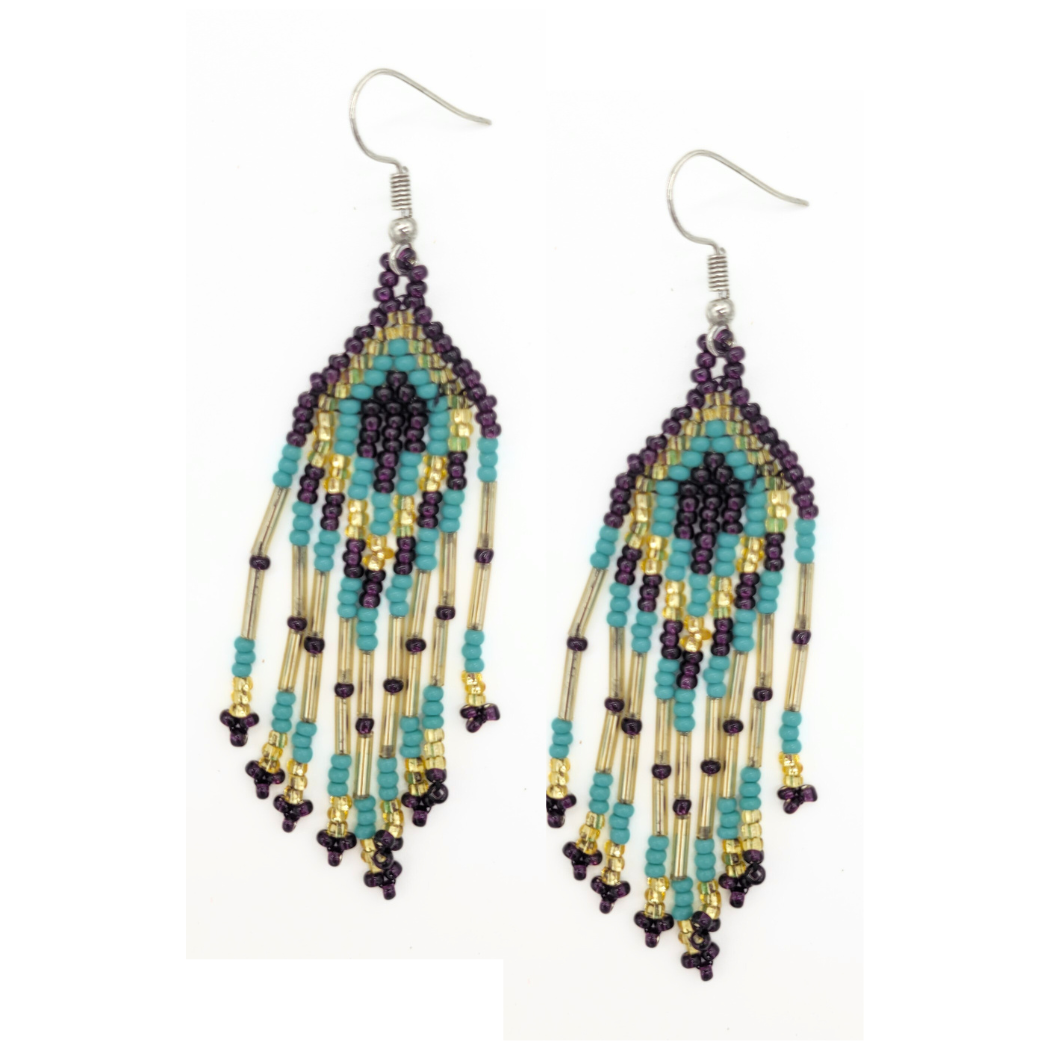 Named for a "spirit of the air" in Shakespeare, these lightweight beaded earrings are buoyant and breezy. They're made of seed beads and tube-shaped beads, deftly arranged in nine strands apiece, in cool bluish tones.