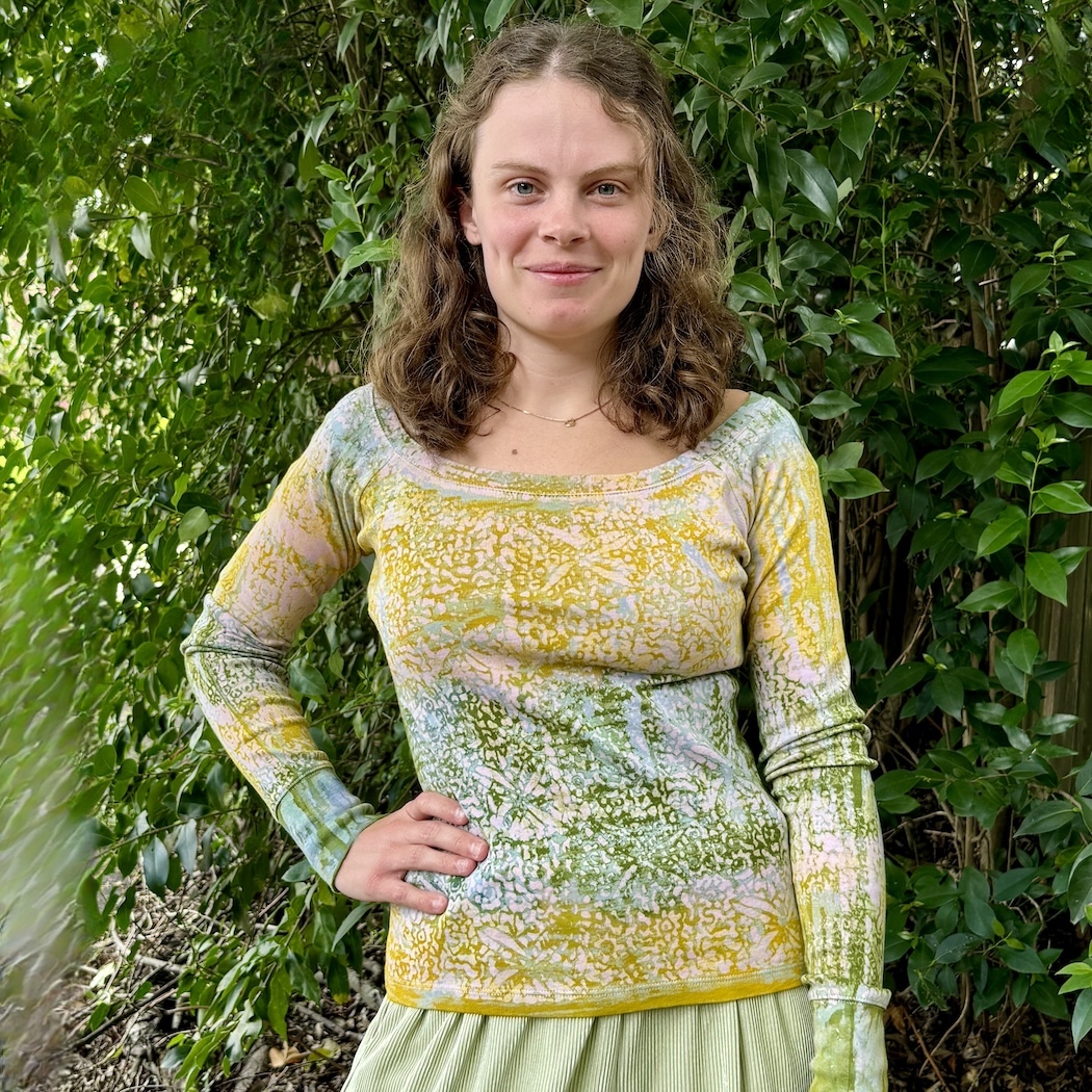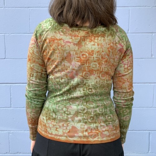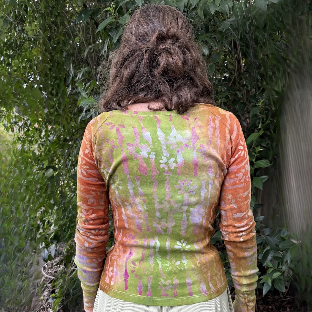 Made of 100% combed cotton, this long-sleeved shirt is feisty and form-fitting. Its fanciful batik designs go beautifully with a solid skirt or a pair of jeans.