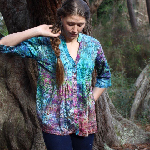 With its pleated front, this casual top looks surprisingly formal. Its other features combine to keep you cool and comfortable: lightweight 100% cotton fabric, three-quarter sleeves, and spacious v-neck collar.