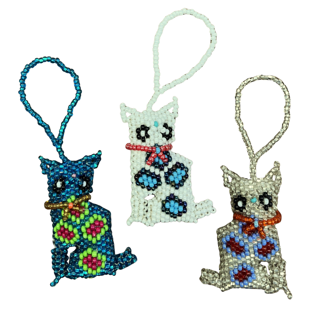 With a shimmer as soft as a purr, this cat makes an appealing ornament. Vibrant colors and geometric shapes, fashioned from seed beads, give it a unique personality. Assorted colors.