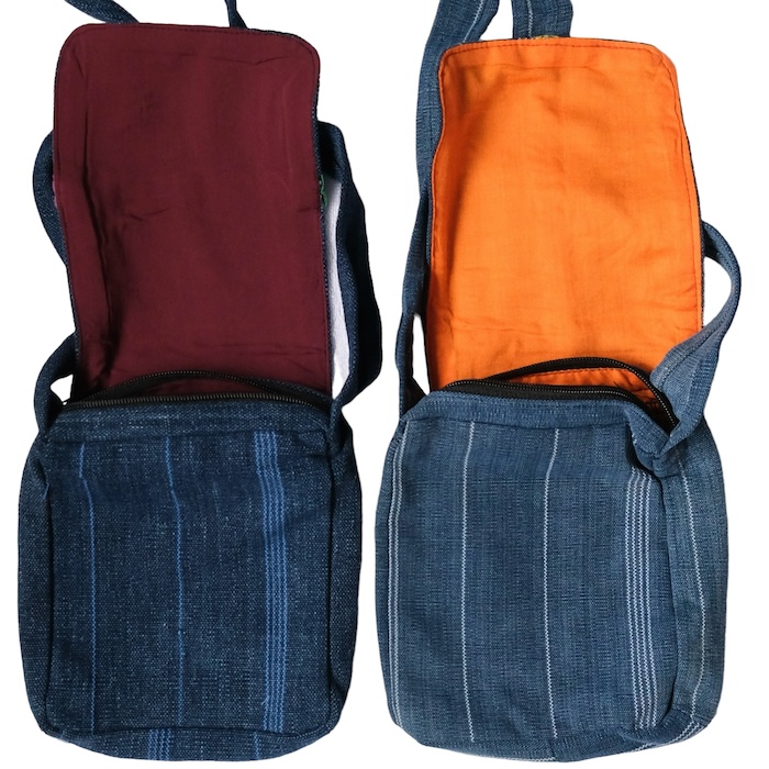 Underneath the embroidered corte flap, the bag has a secure zip top and another zippered pocket on the inside for your cards, coins, extra pairs of earrings, etc. The long 100% cotton strap, made of matching corte, is soft and comfortable. Assorted colors.