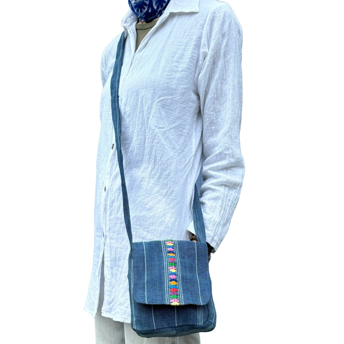 This small crossbody bag is all about craftsmanship, from the vibrant hand-stitched embroidery on the front and back to the blue repurposed 100% cotton CORTE it was made from. Each bag is made from a different upcycled corte, giving them an extra touch of individuality and artistry.