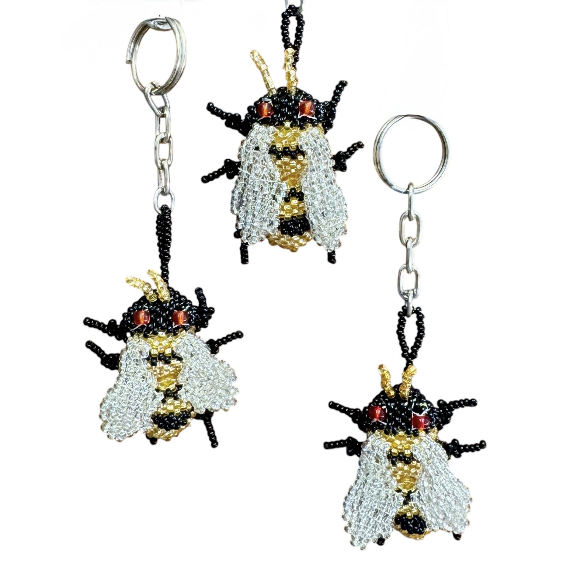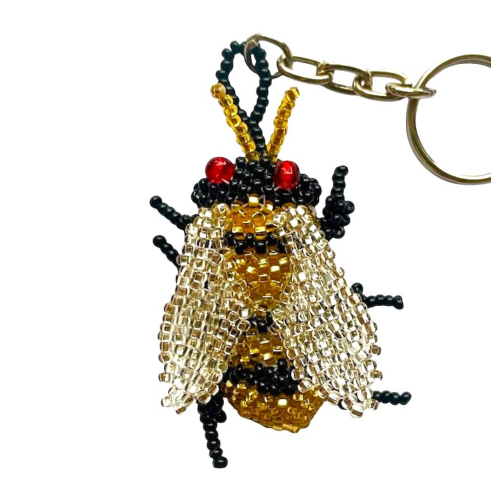 Here's a buzzworthy accessory: a bumblebee made of glittering seed beads, with larger red beads for the eyes. This keychain is interactive, as you can adjust the legs, the wings, and even the antennae!