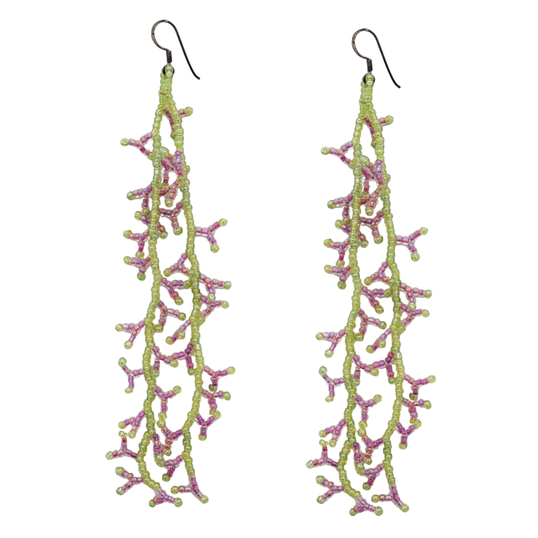 Like our caribou two strand beaded earrings, these beauties mimic the look of coral formations. Their longer dangle adds to the animation of the double strands, each of which is covered with gleaming seed beads.