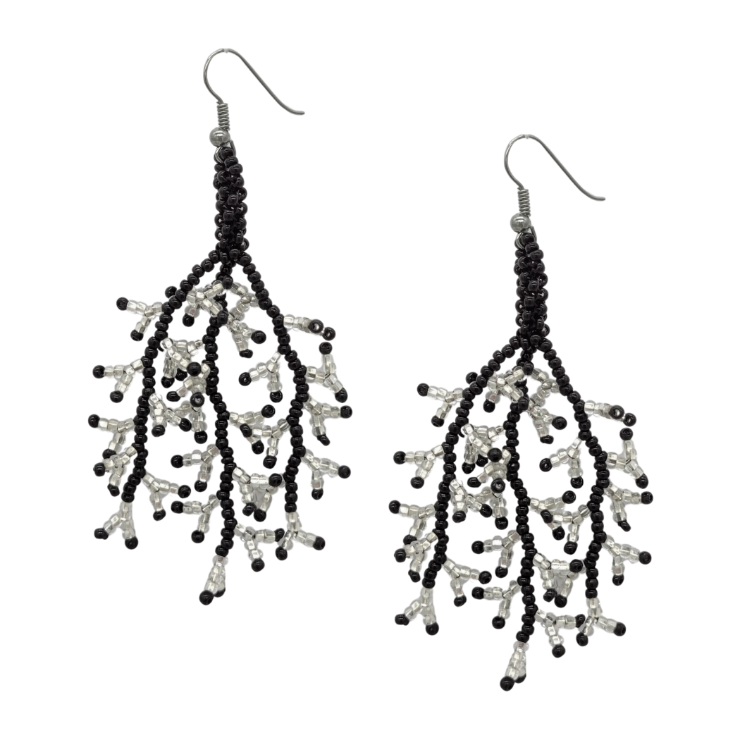 These earrings have a strong organic feel, like a lovely coral formation. Each trio of strands is covered with seed beads in iridescent colors.