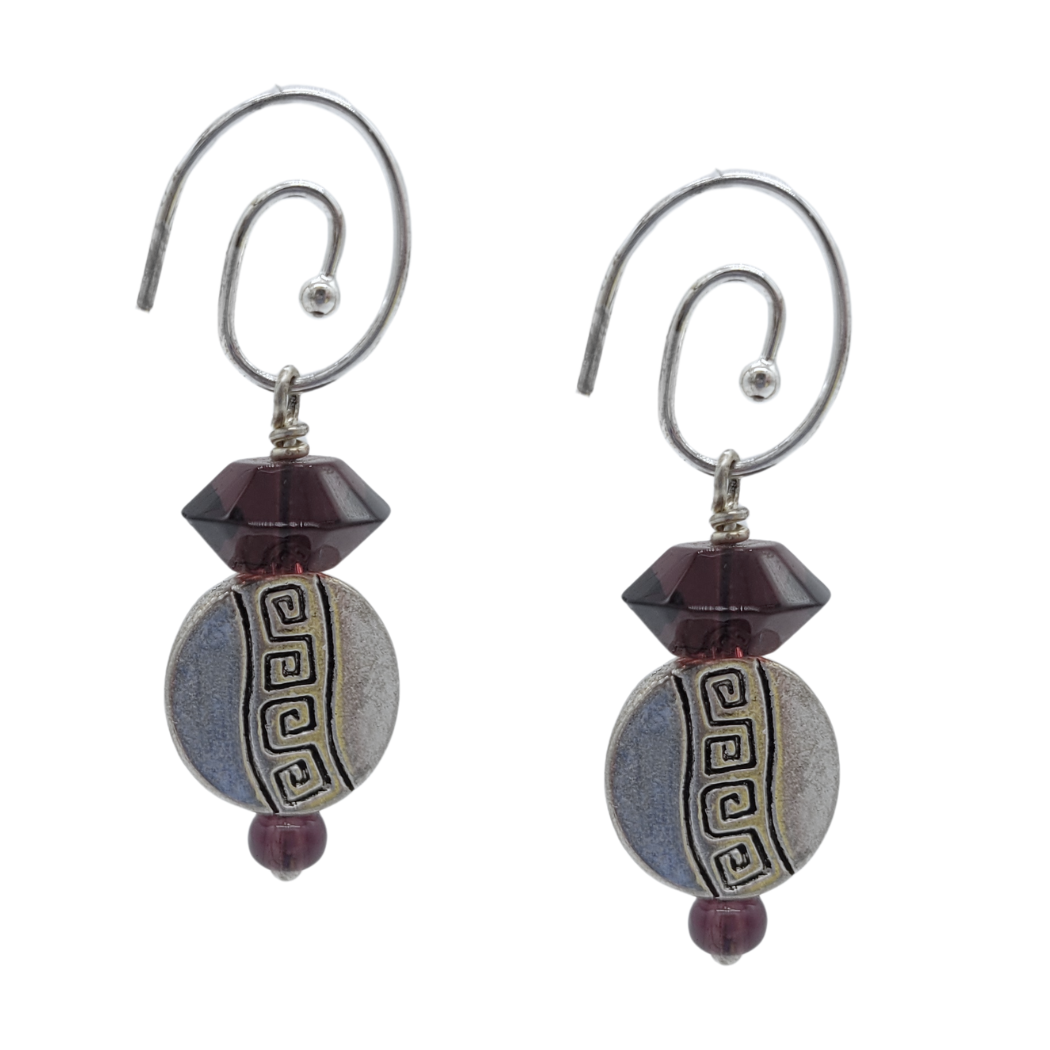 Between their gleaming beads and their silvery metal disks, these earrings are sure to attract attention. Each disk features a cool Greek key design.