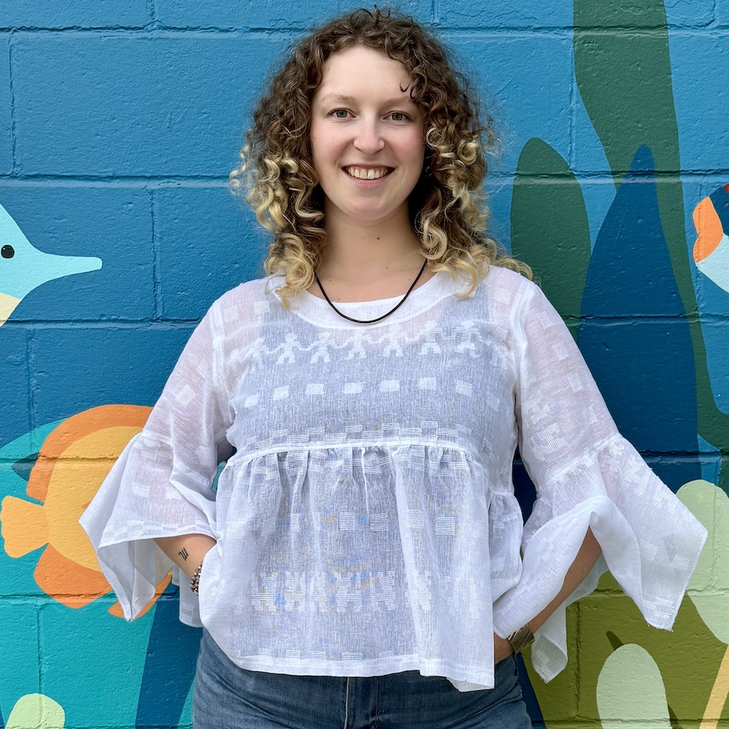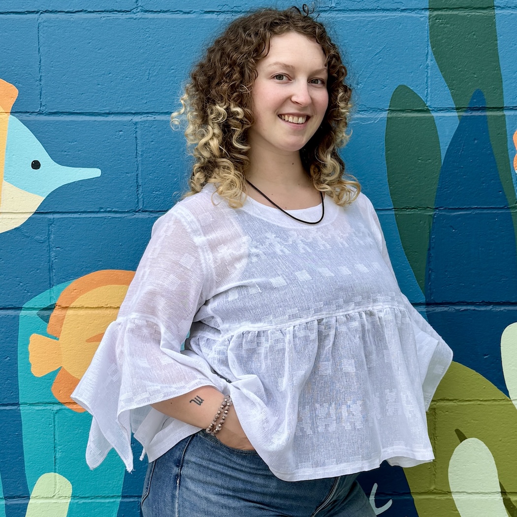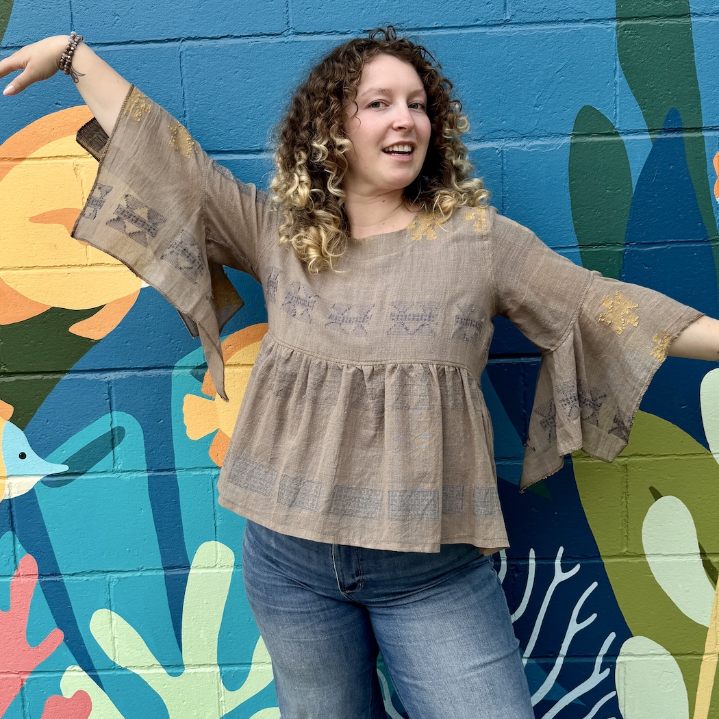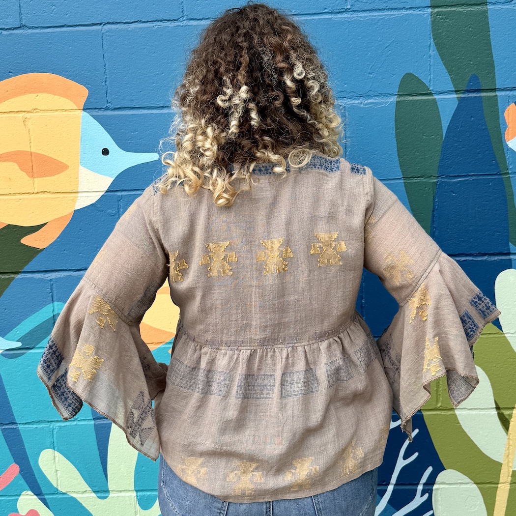 As light as a feather, this graceful top features wide sleeves that flutter with your every move. It's made of 100% cotton, embellished with stylized designs and geometric shapes. All in all, it's the perfect combination of charm, comfort, and eye appeal.