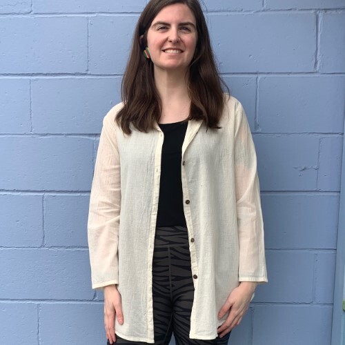Lightweight cotton makes this shirt a sheer delight. In addition to long sleeves and a soft collar, it features buttons carved from coconut shell. One size.