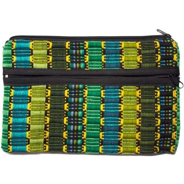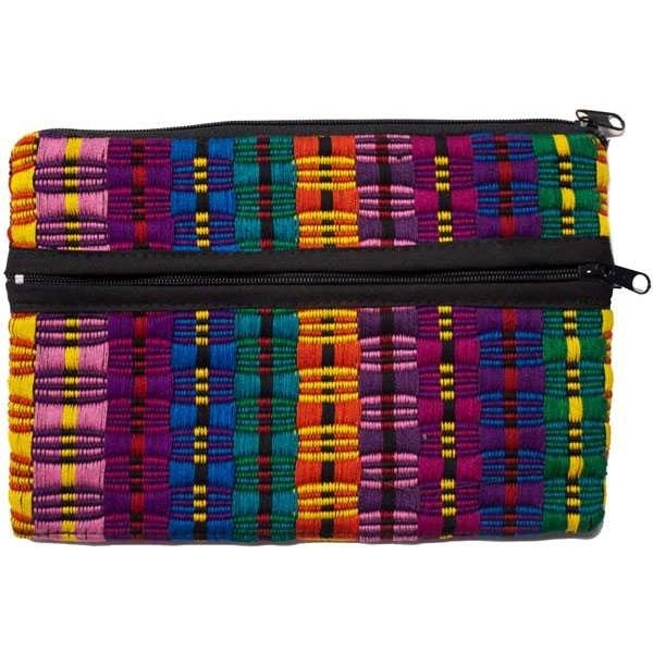 Nothing will escape this handwoven pouch! Three zippers keep everything safe, from your money to your makeup. Assorted colors.