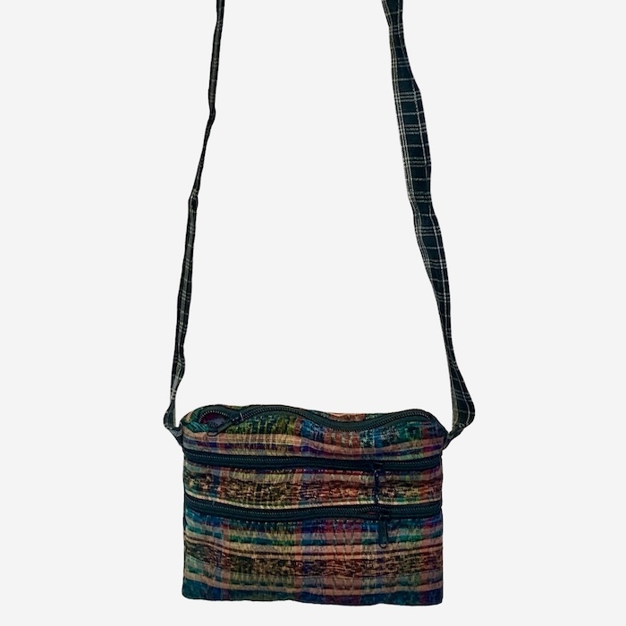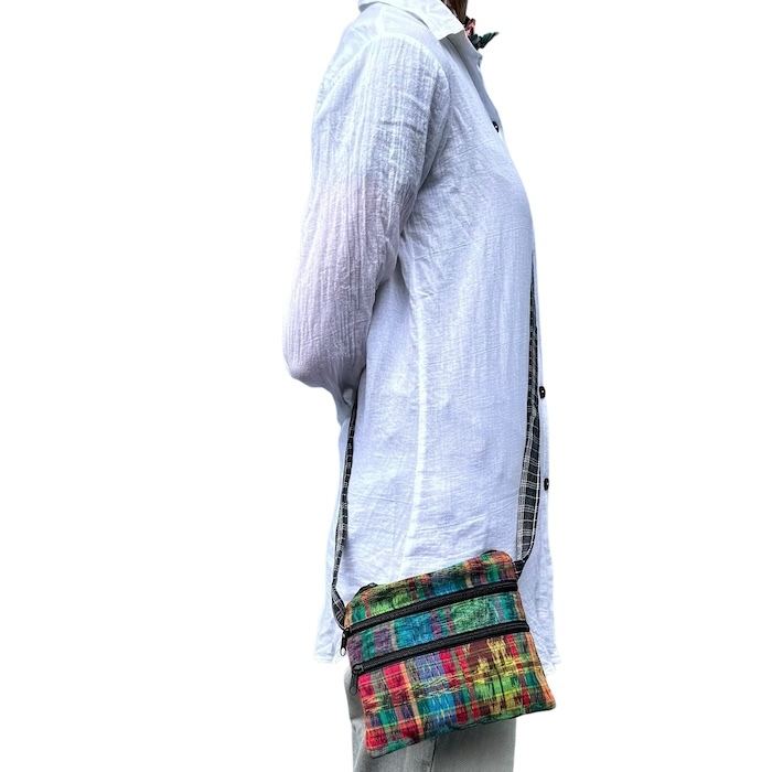 The long strap (also made of upcycled 100% cotton corte) makes this the perfect crossbody bag for traveling, and the slim compact design means it fits easily into your suitcase or carry on bag. Assorted patterns and colors.