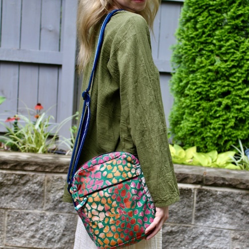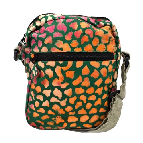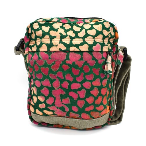 Bold colors, both inside and out, distinguish this attractive bag. The exterior, made of soft cotton batik, features two zippered pockets -- one hidden under a flap. The interior, meanwhile, has a solid pink cotton lining and three more pockets. Assorted colors.
