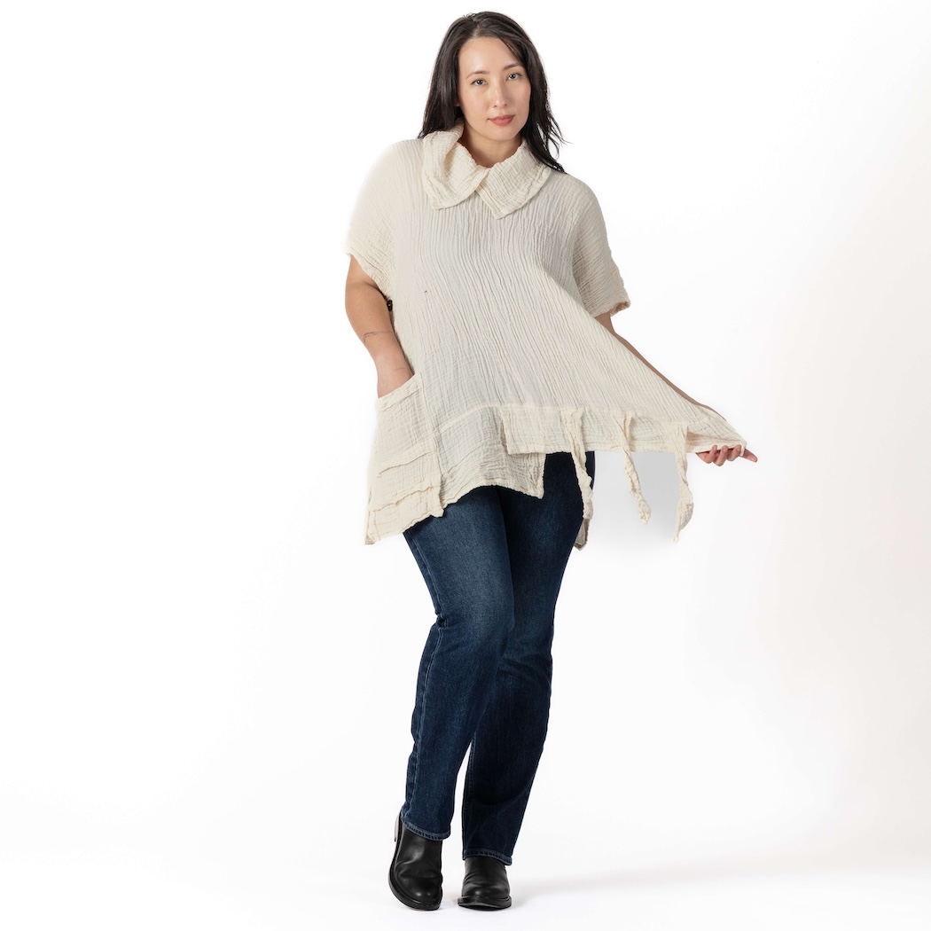 Decidedly different! This roomy top mimics a poncho, while adding a cowl neck, a pocket in front, and decorative strips at the bottom. It's made of soft gauzy cotton, with coconut shell buttons securing the sides.
