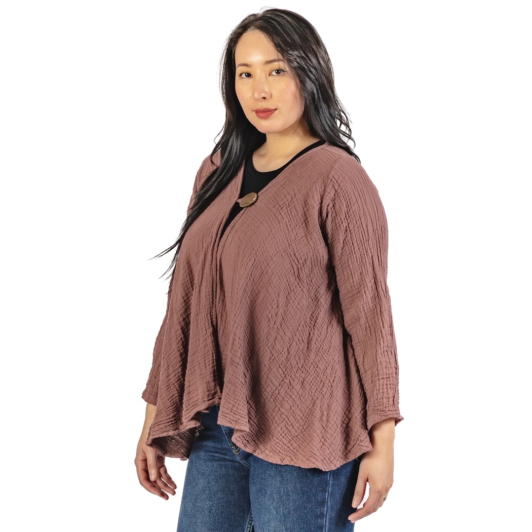 Gauzy cotton makes this jacket super light and airy. It fastens with a whimsically large button, made from coconut shell. One size.