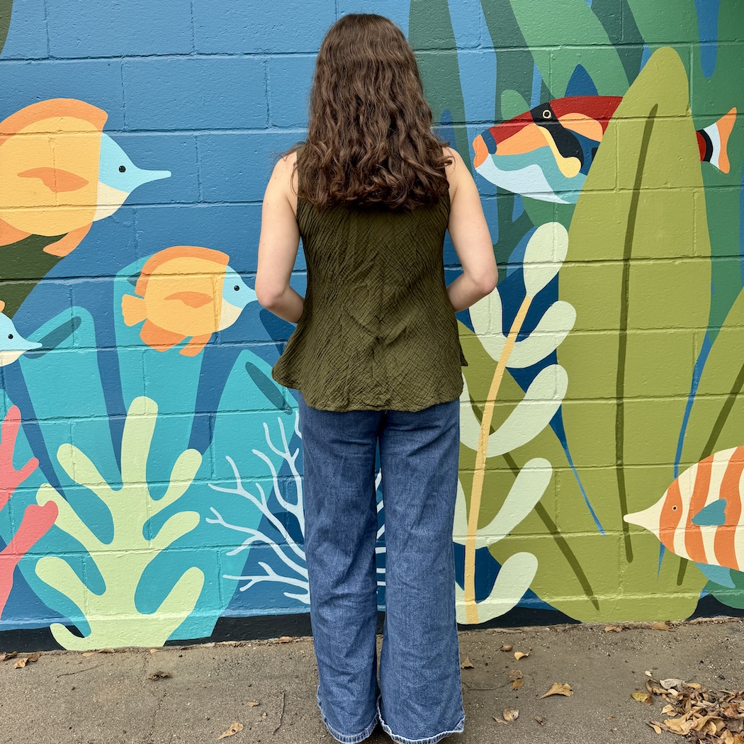 Measurements: 14" chest, 40" waist, 56" hips, 27" L in front, 23" L in back