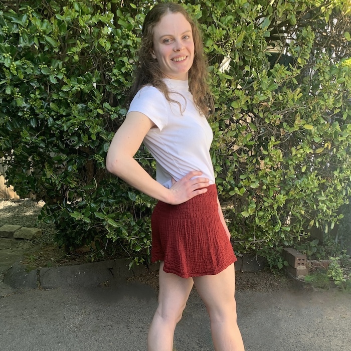 Measurements: 3" inseam, 41" hips, waist that stretches from 20" to 34"