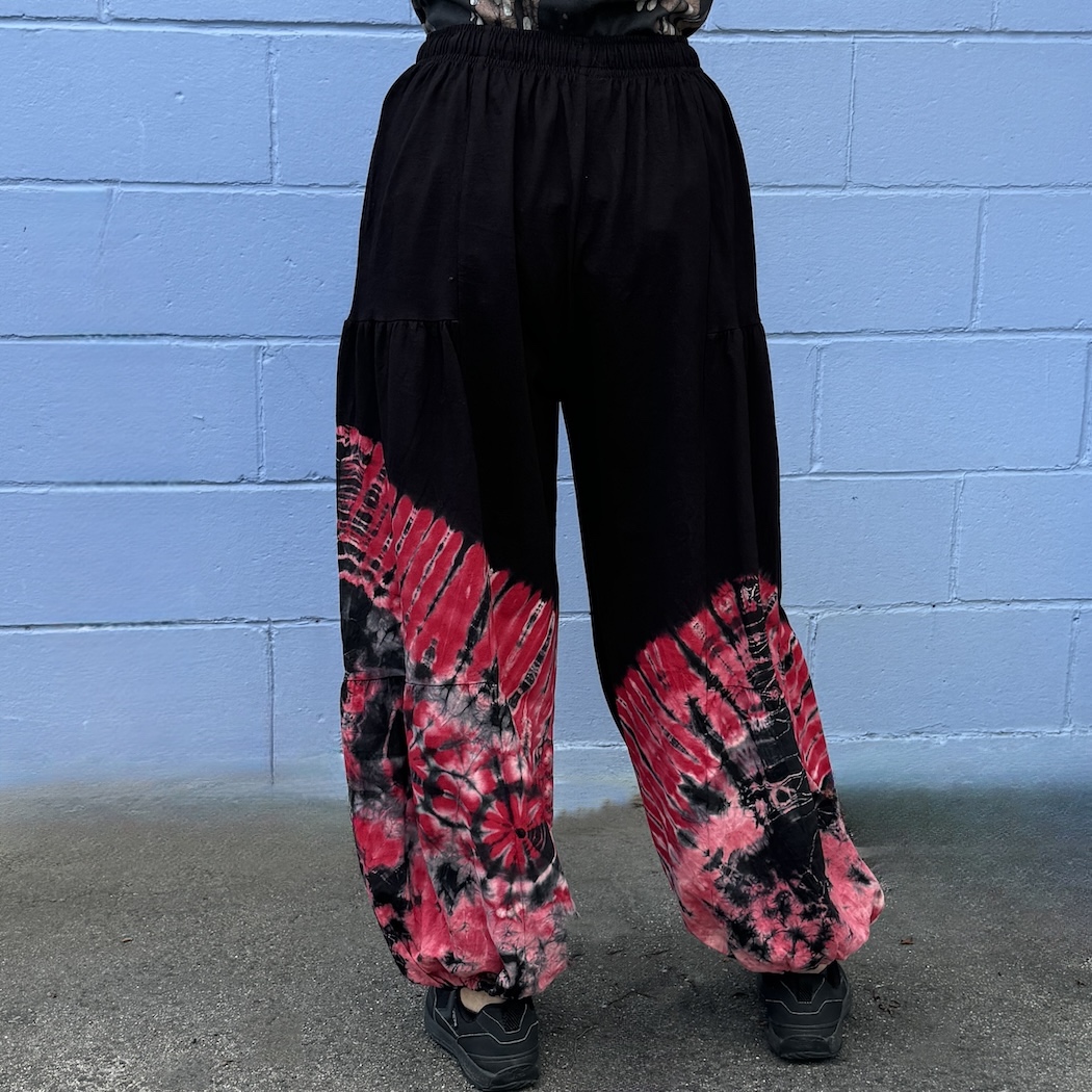 These 100% cotton pants are great for chilling at home, but you can dress them up, too. The rich tie-dyed colors are sure to attract attention, and the elastic drawstring waist makes for an easy fit. One size.