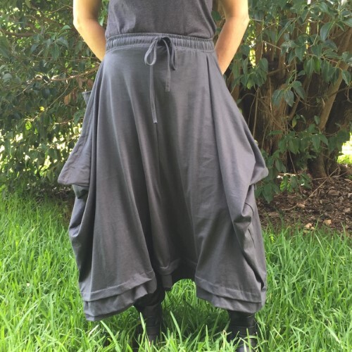 With its winged sides and drawstring waist, this cotton piece redefines versatility. You can leave the sides open and flowing, or cross and button them in the front. What's more, you can change the pants into a skirt by unfastening the buttons at the bottom. One size.