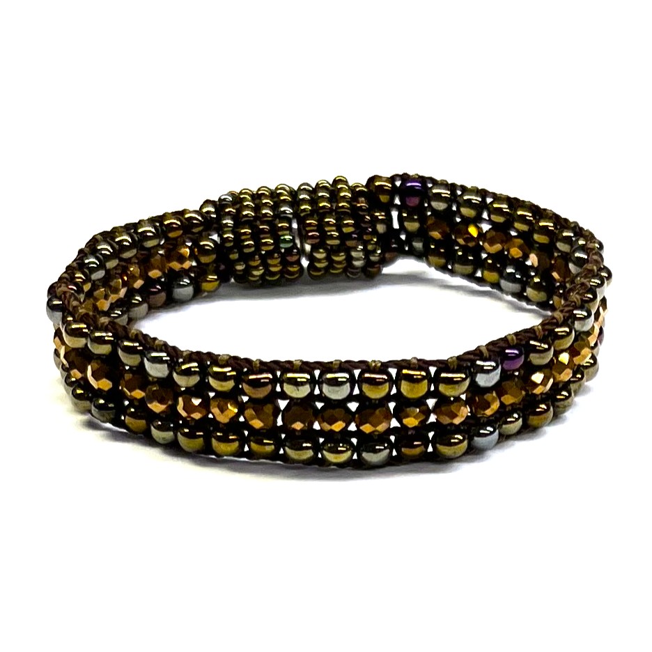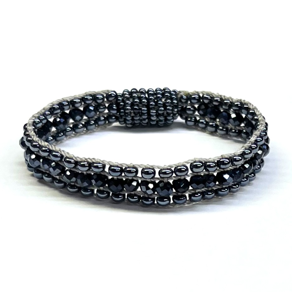This dark, sophisticated bracelet features a line of crystal beads between two lines of metallic seed beads. The magnetic clasp makes it easy to put on and remove. Assorted colors.