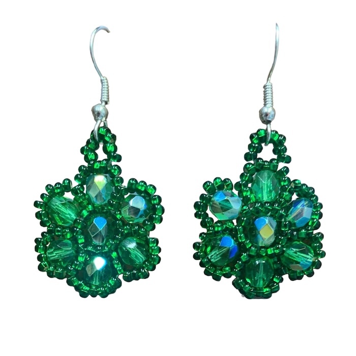 Seed beads form the petals of these stylized floral earrings, while crystal beads add sparkle, mimicking the morning dew.