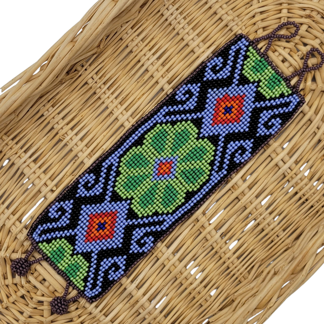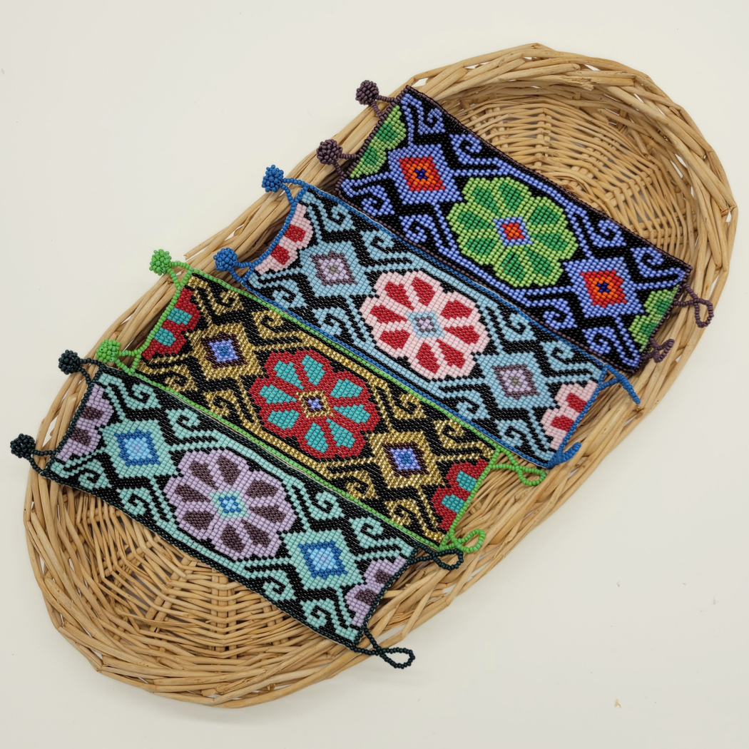 This cuff bracelet is perfect for anyone looking to make a statement! A bold, beaded flower is the standout element of the design, but not the only one worth noting. The bracelet’s width, varied colors, and intricate beadwork transform it from a simple accessory to a piece of art that showcases expert craftsmanship. The closure, consisting of two beaded balls and two beaded loops, ensures a secure, comfortable fit without sacrificing style.