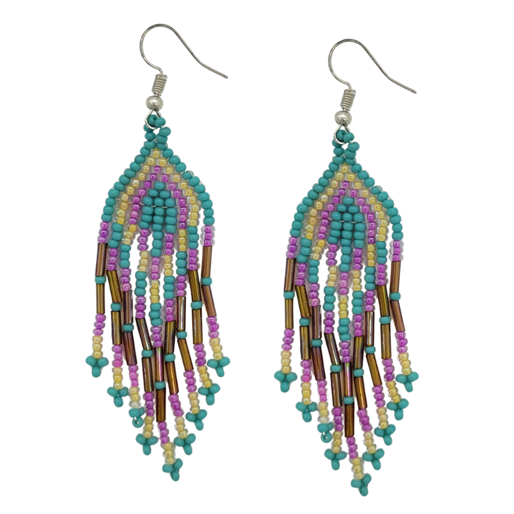 On each of these multistrand beaded earrings, a diamond morphs into a colorful cascade. Nine strands apiece are covered with seed beads and tube-shaped beads. Assorted colors.