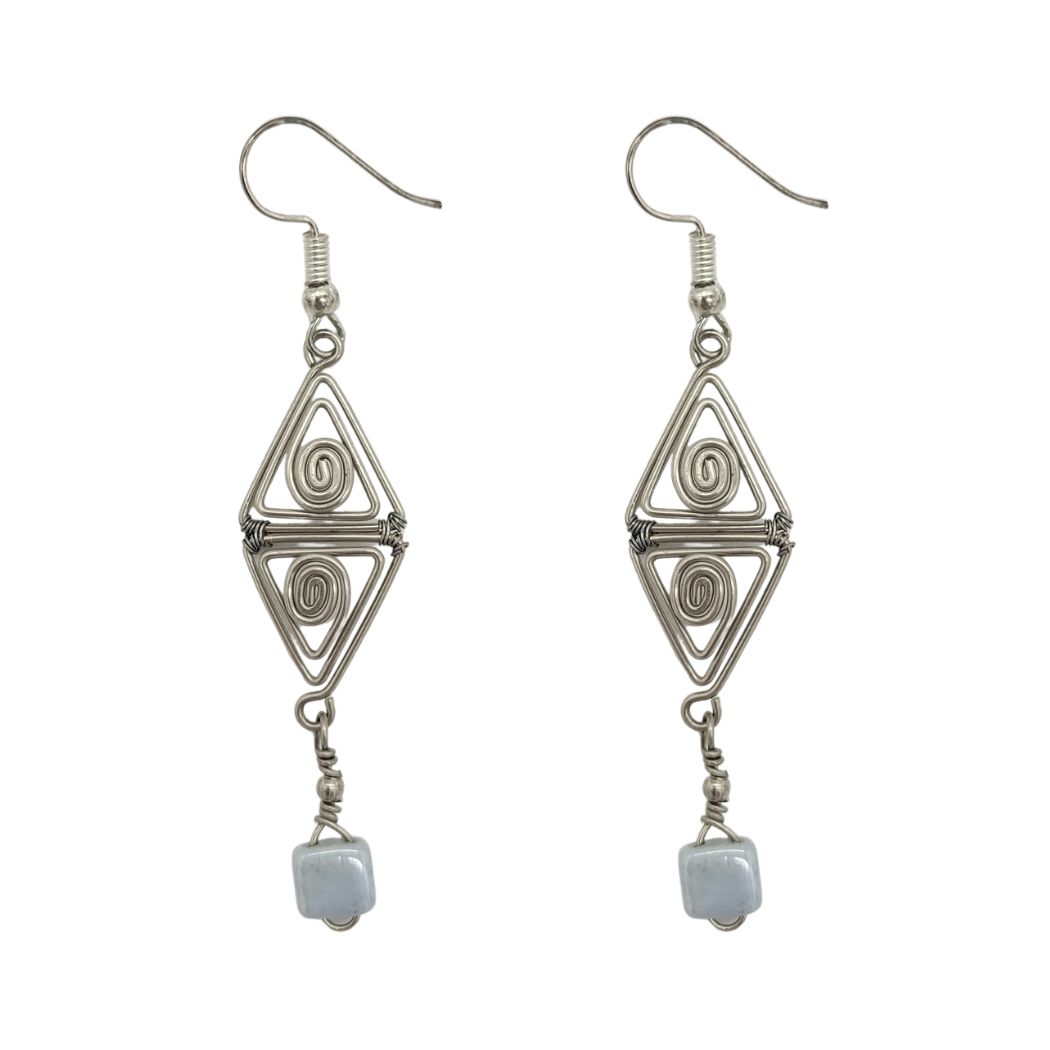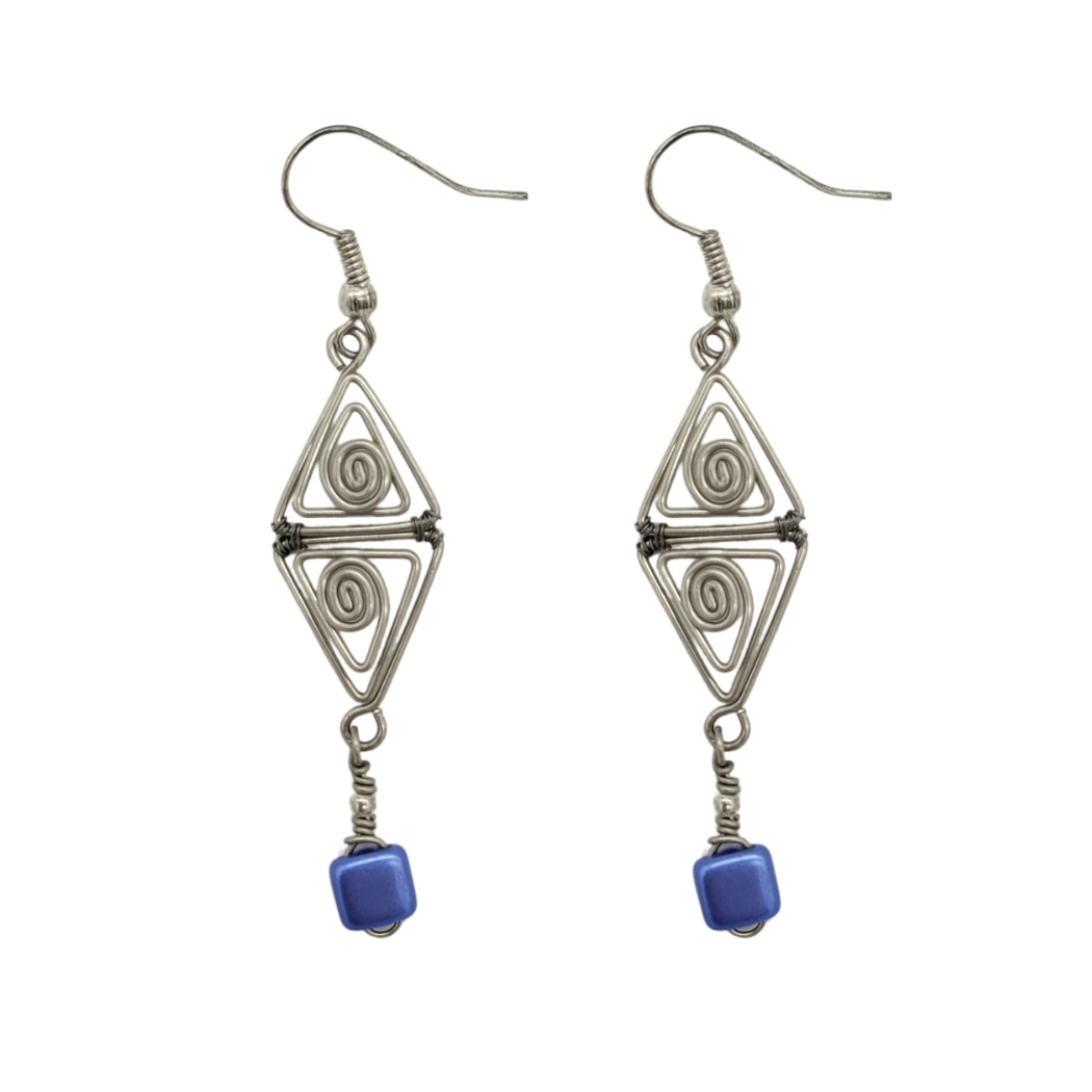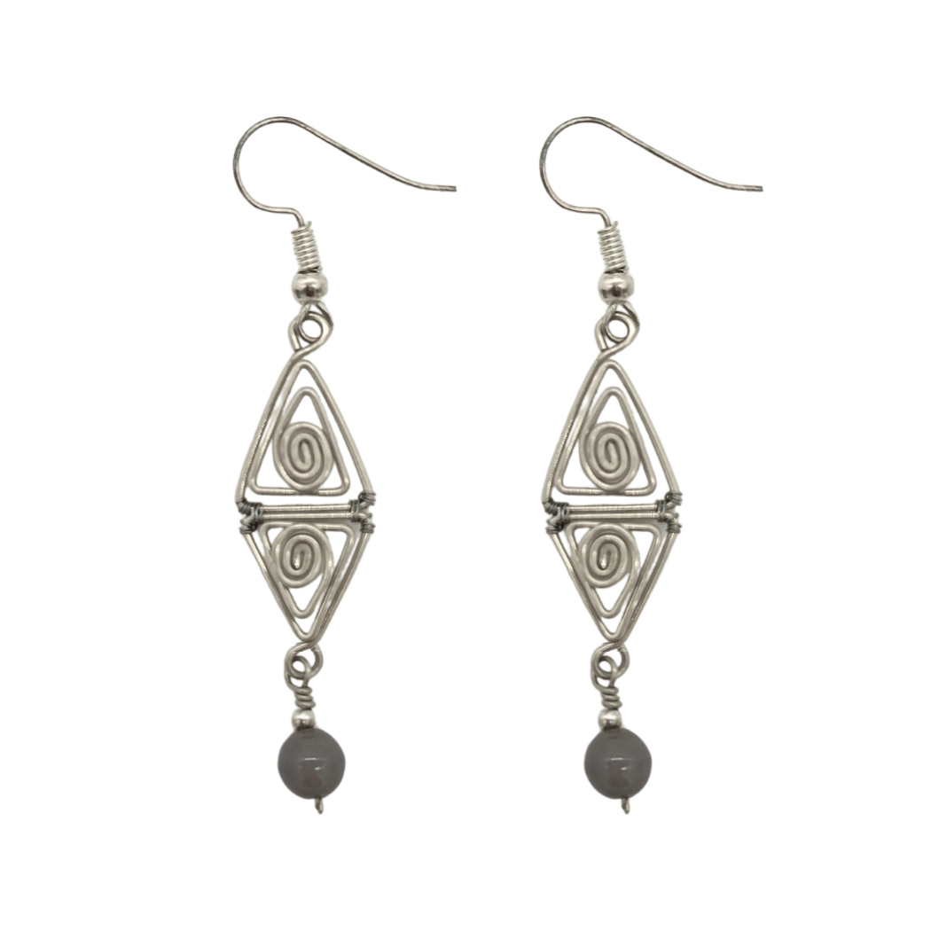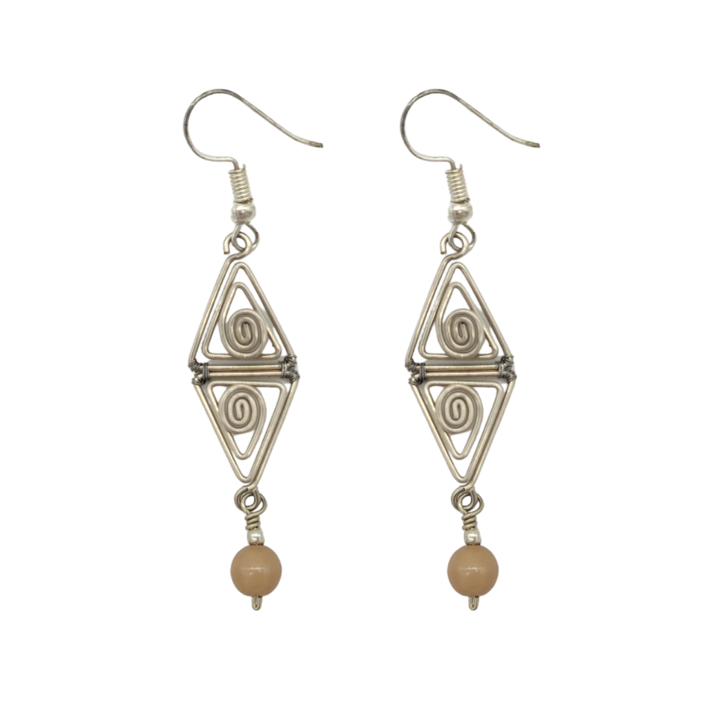 These geometric beauties will add a new dimension to any outfit. On each earring, two spirals of shaped wire transform themselves into a pair of triangles with a gleaming bead below.