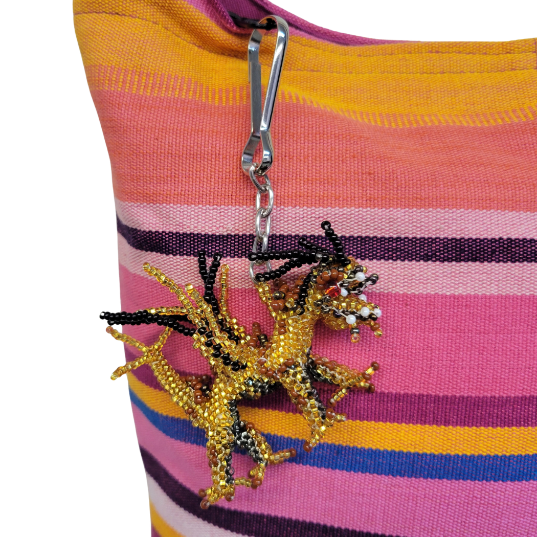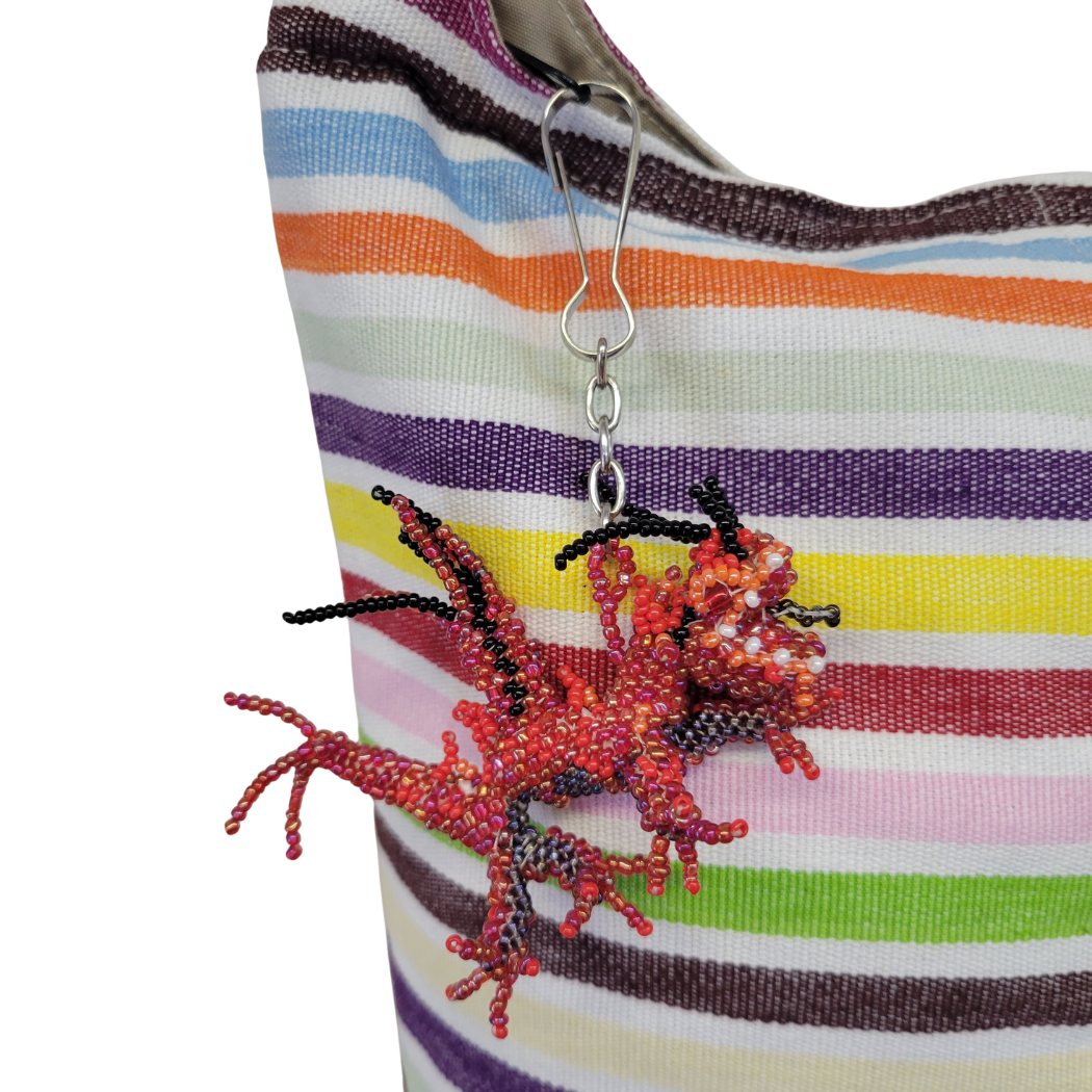 Protect your purse or backpack with this scary little bag charm, made of seed beads in volcanic colors. From its horns to its wings, the dragon is anatomically (or at least mythologically) correct. What's more, it has a beaded loop and a sturdy metal clip, for easy attachment.