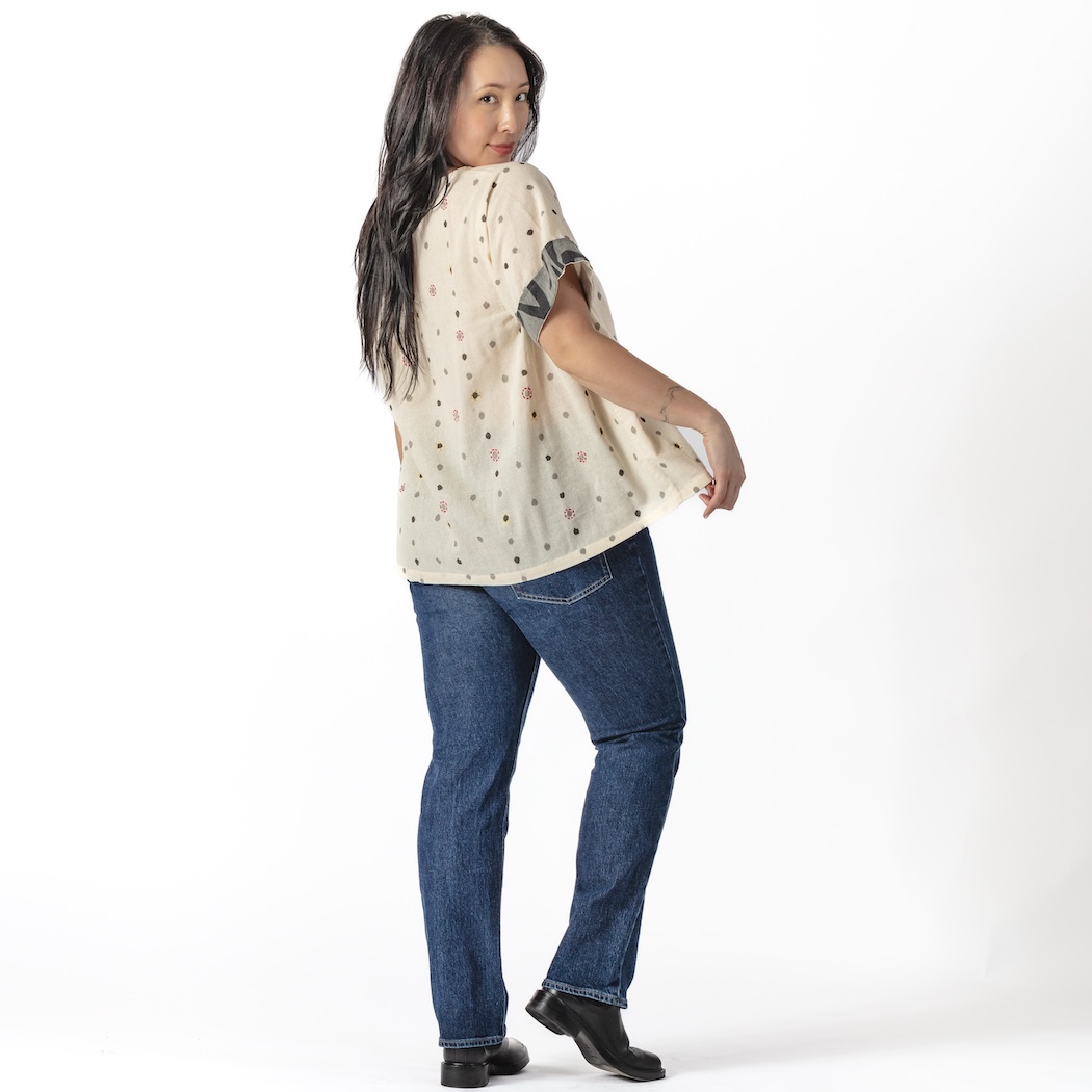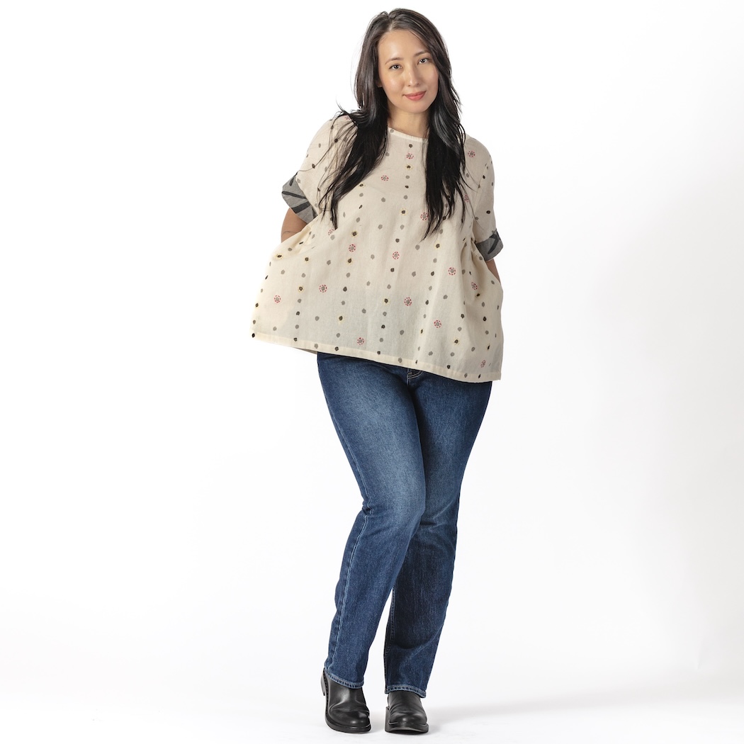 Lovely and lightweight, this cotton top abounds with painted dots accented by charming colorful embroidery. It also features a wide neck, a pair of hidden side pockets, and hand-painted trim on the short sleeves. One size.