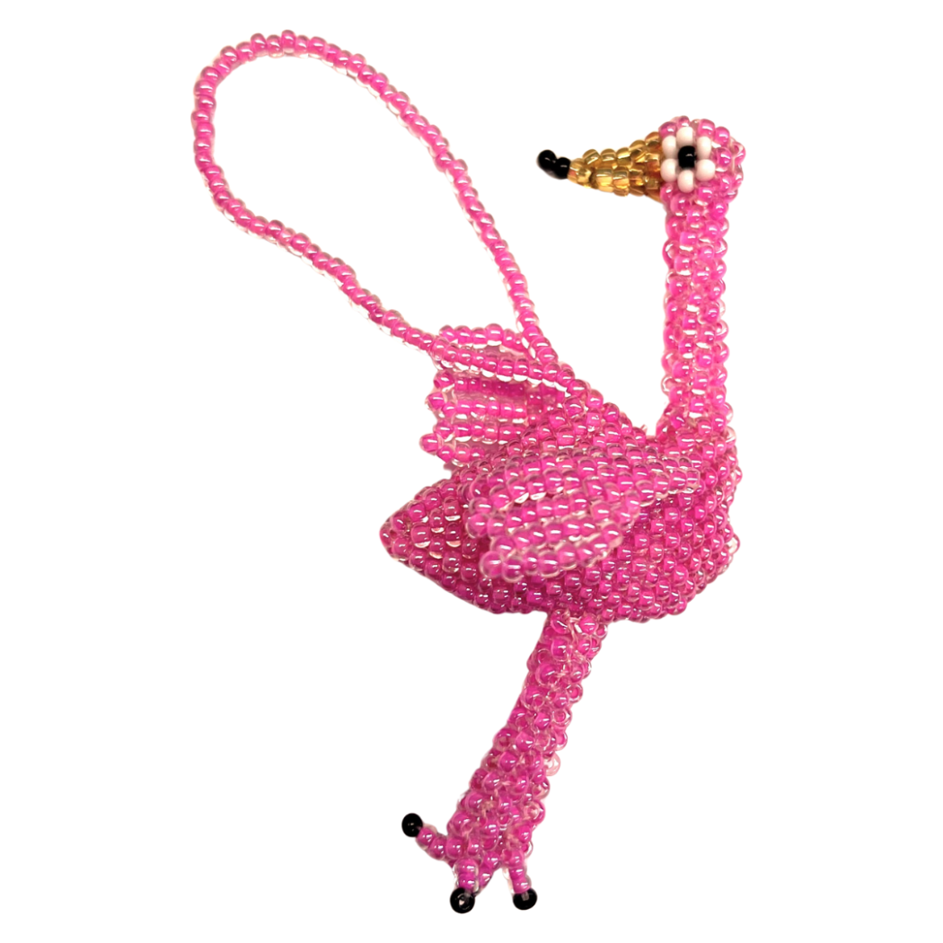 With its bright pink plumage, this hand-crafted flamingo makes an eye-catching decoration. Scores of shimmering seed beads create the exotic bird, which comes in assorted designs.