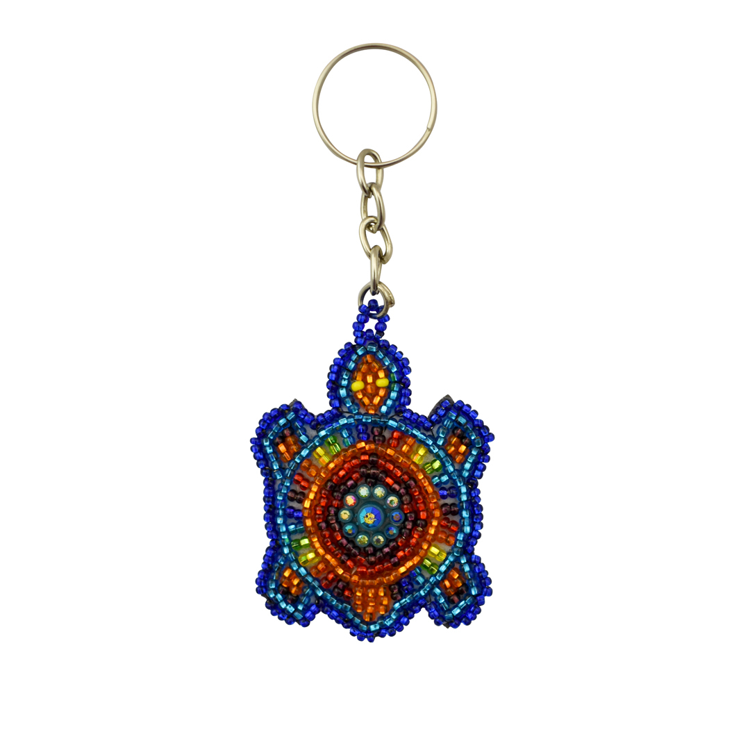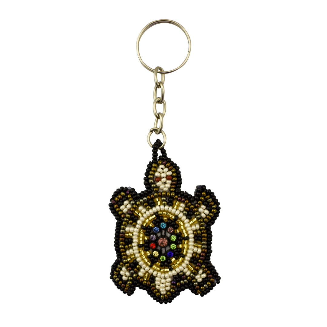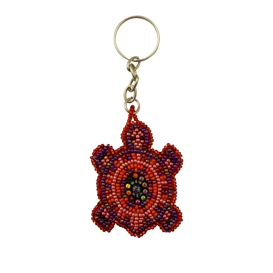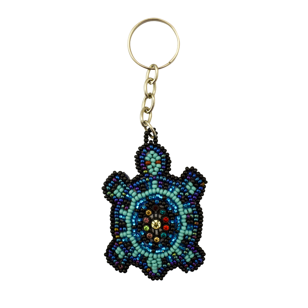Hailing from Guatemala, this beaded keychain is a colorful travel companion. Made of vibrant seed beads, with sparkling crystal accents at the centers of their shells, each turtle is beaded by hand. Their flat shape highlights their intricate two dimensional beaded pattern, and means they can fit easily into any purse or pocket.