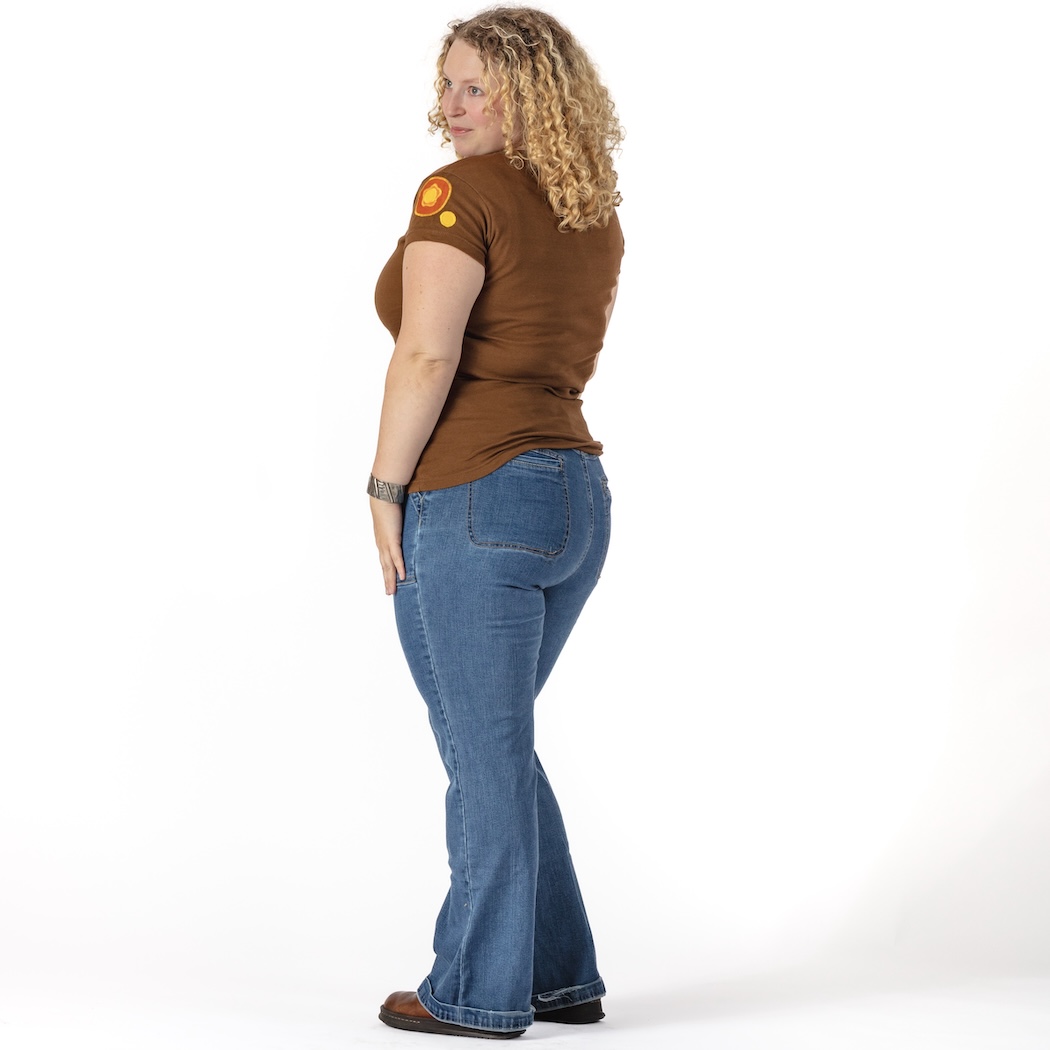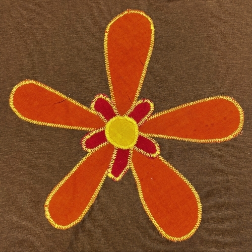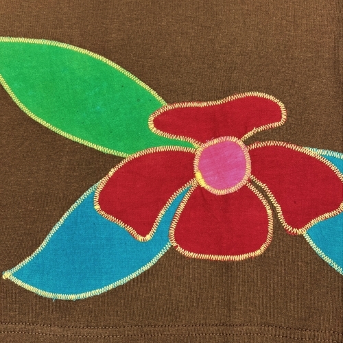 To set this classic scoop neck fitted t-shirt apart, repurposed flour sacks were dyed, cut, and appliqued onto them, creating vibrant flowers. Because each patch is created from a different flour sack, they're all unique. The shirt itself is soft 100% cotton, with a scoop neck and short sleeves.