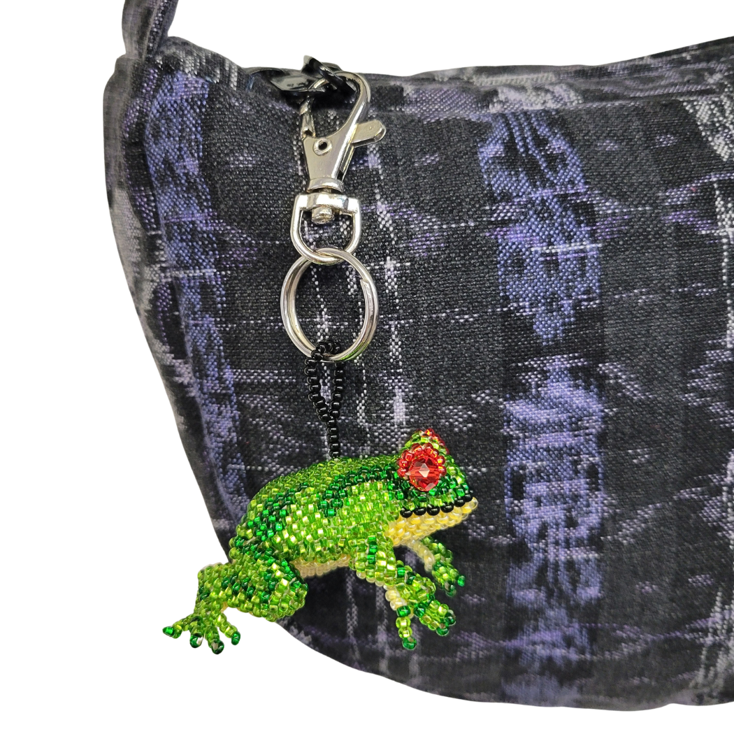 Glistening seed beads create beautiful shades of green, along with a pale yellow belly. The charm has a pair of bright crystal beads for eyes, as well as a metal clasp for easy attachment and a ring that turns the charm into a keychain.