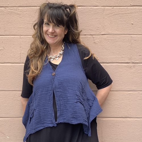 On days hovering between winter and spring, this lightweight vest is a great choice for layering. Made of 100% cotton, with a pair of side pockets, it adds rich color to any patterned top. One size.
