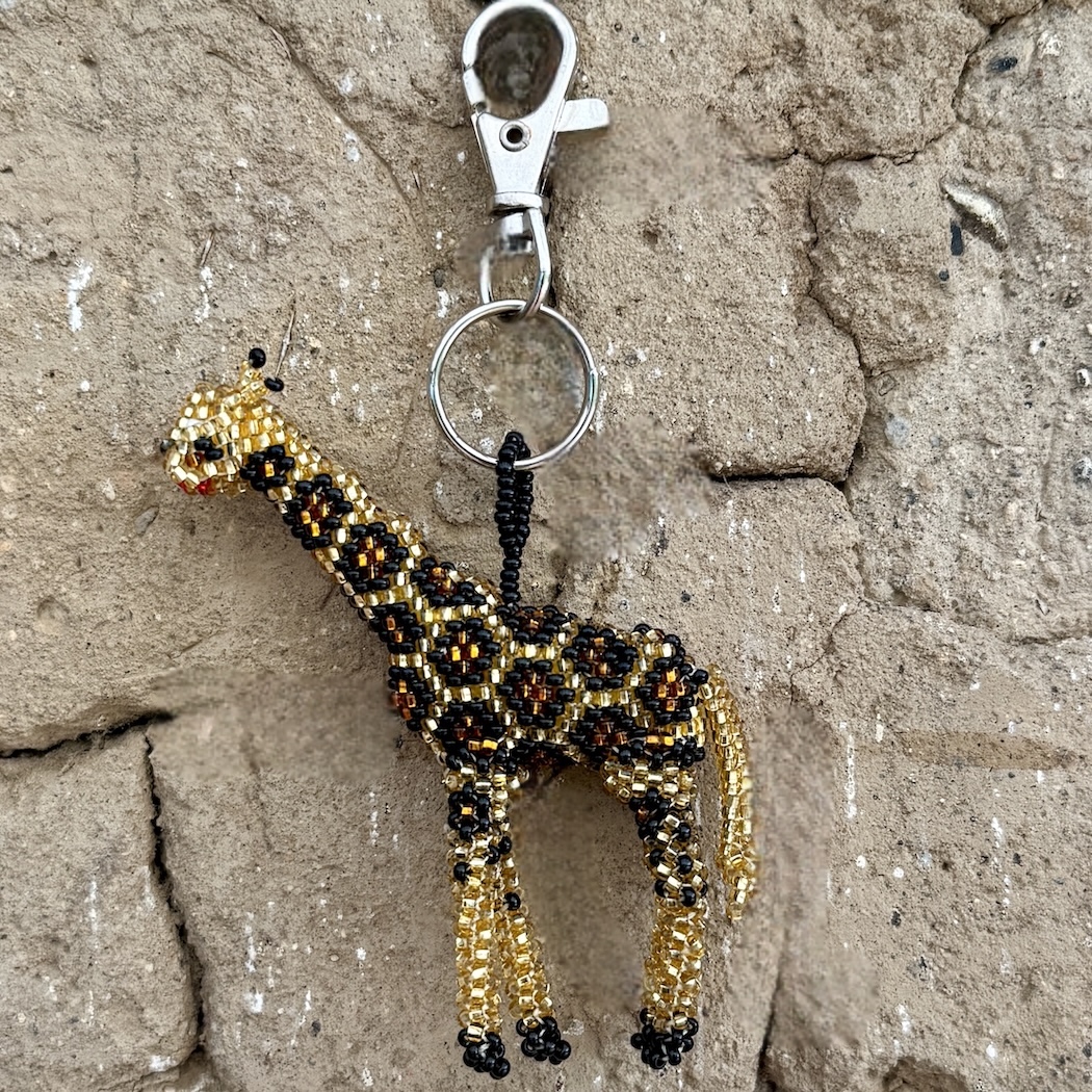 This charm is a real standout: a towering giraffe, made of glittering seed beads. With its sturdy metal clasp, the charm attaches easily to any bag or backpack.