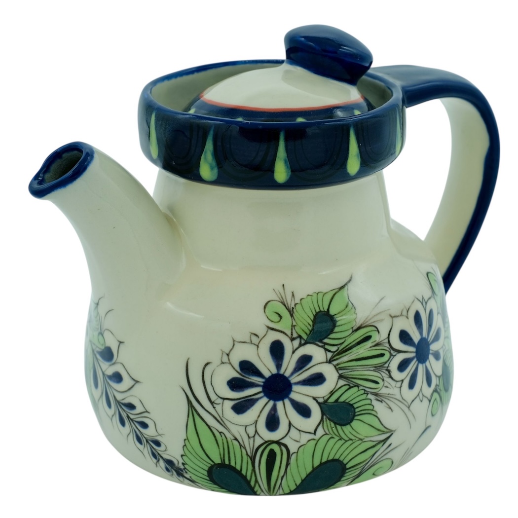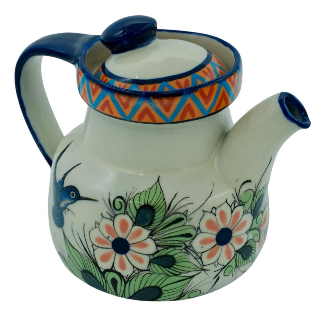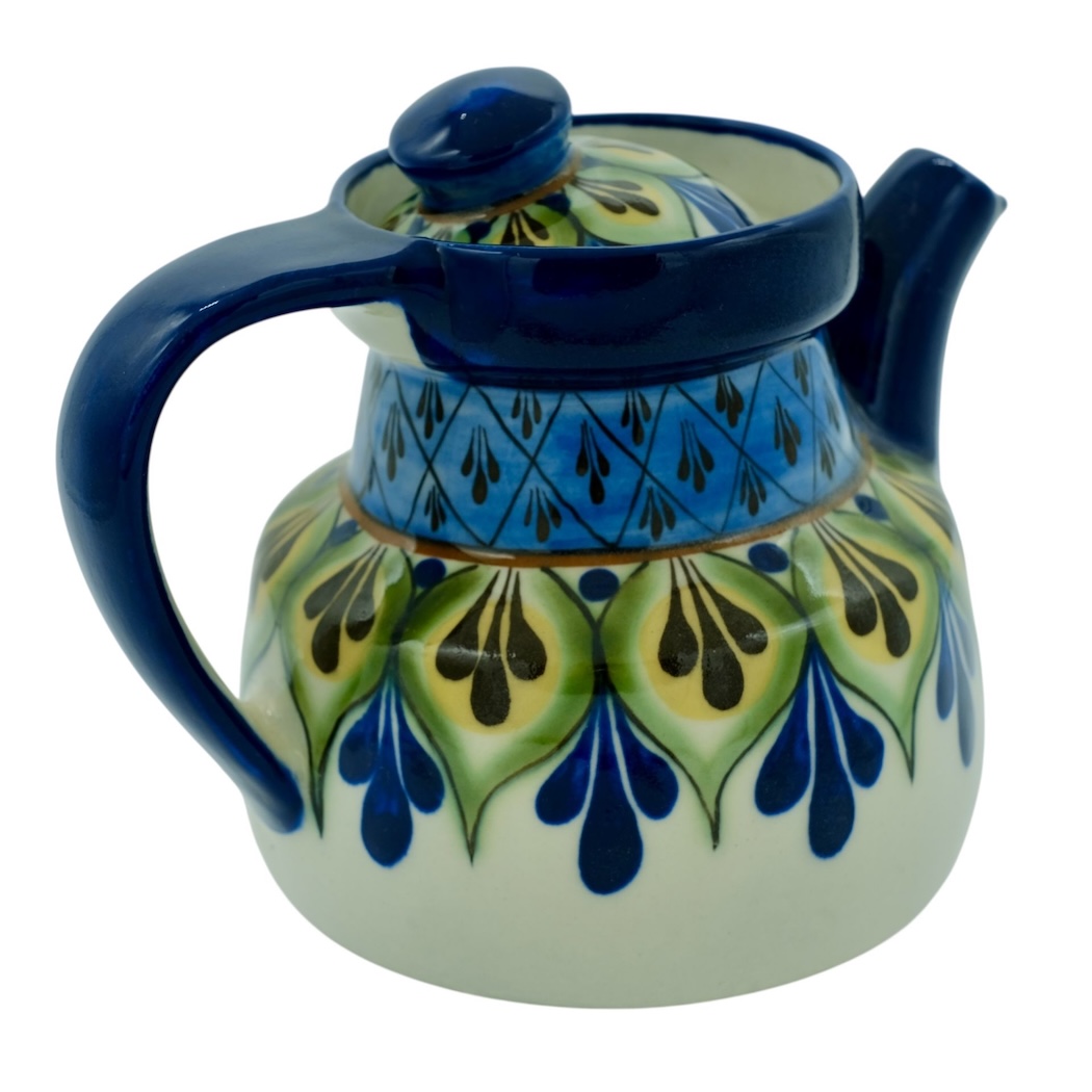 This handsome, hand-painted teapot makes a big, bright impression! The colors pop on the gleaming ceramic surface, and the lid has a unique offset handle, for easy use. Assorted colors and designs.