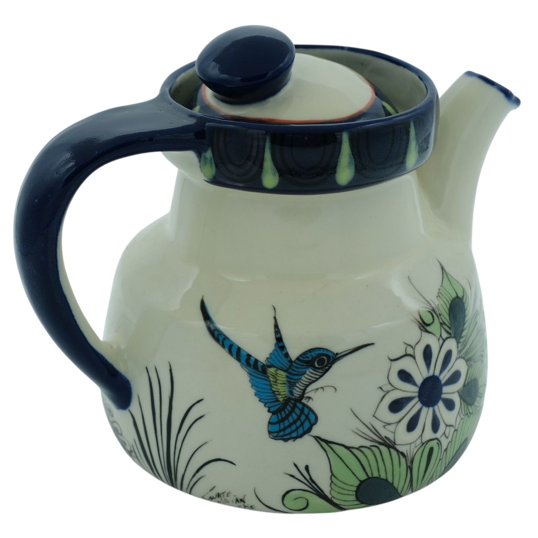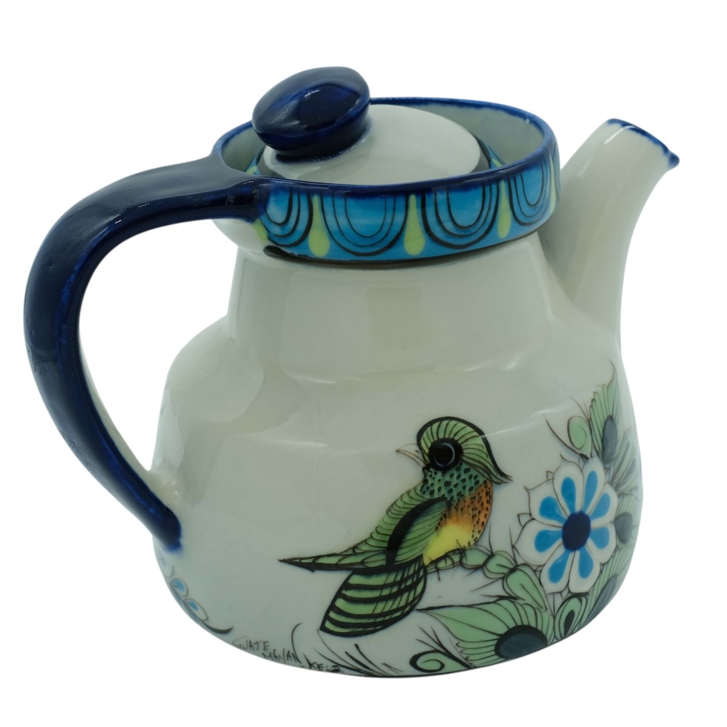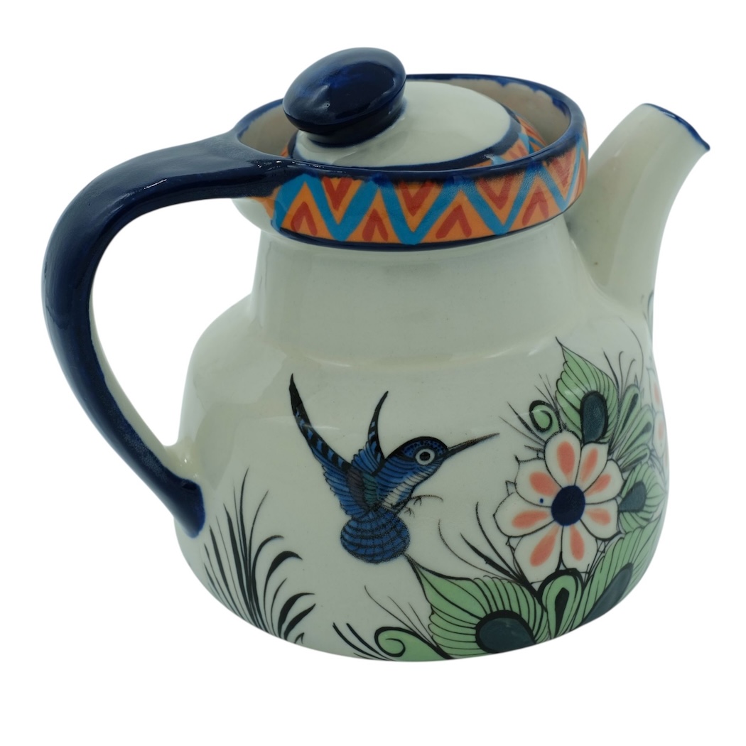 This handsome, hand-painted teapot makes a big, bright impression! The colors pop on the gleaming ceramic surface, and the lid has a unique offset handle, for easy use. Assorted colors and designs.