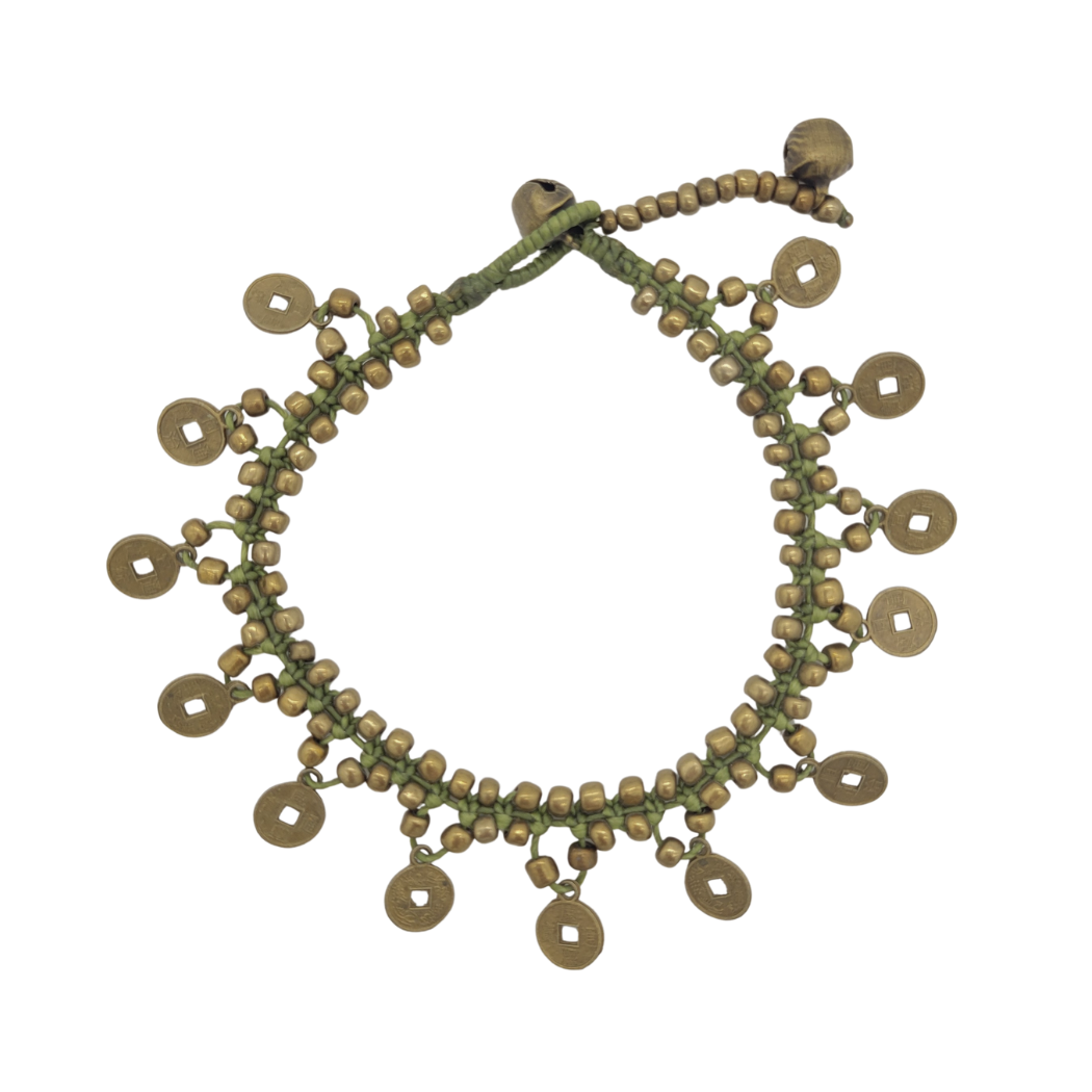 This is one honey of an anklet! Thai coins, accented by gleaming brass beads, dangle from a colorful cord of waxed cotton. Assorted colors.