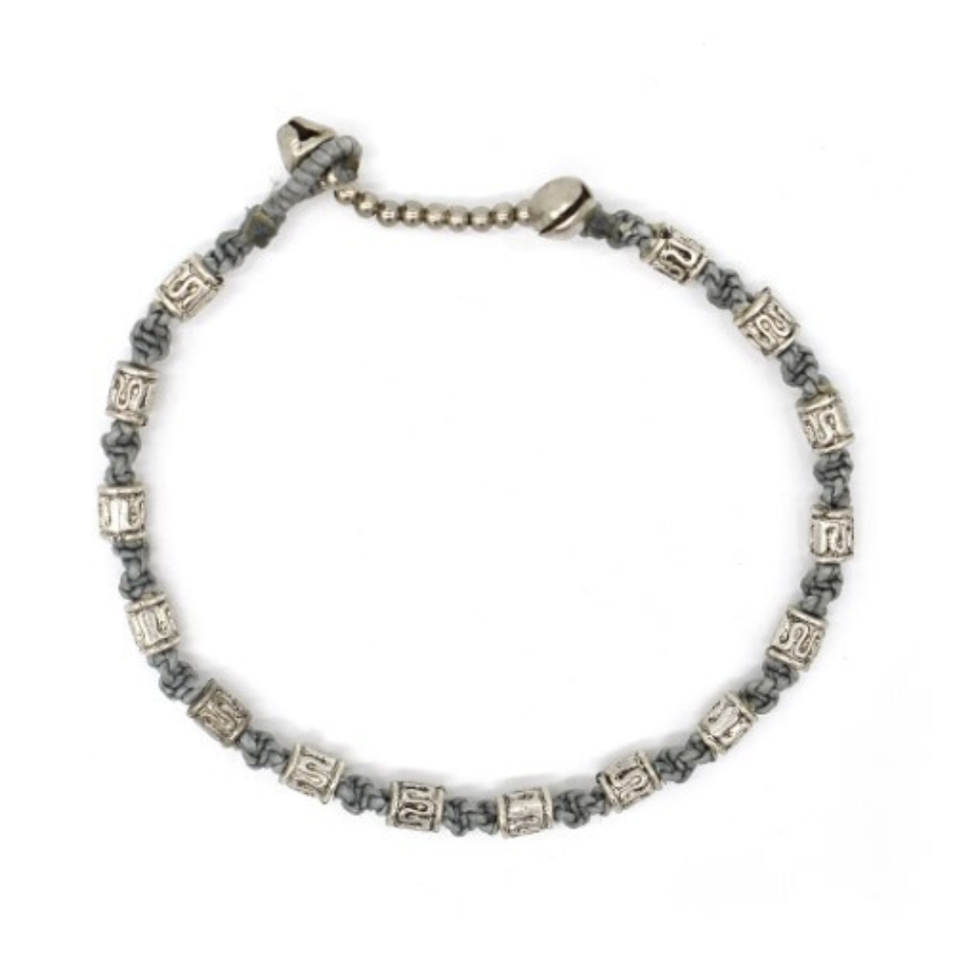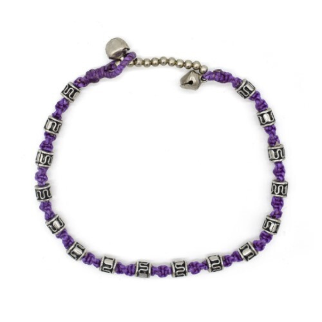 On this jazzy little anklet, metal drums create a visual rhythm. The band is made of waxed cotton cord, with two small bells at the end. Assorted colors.