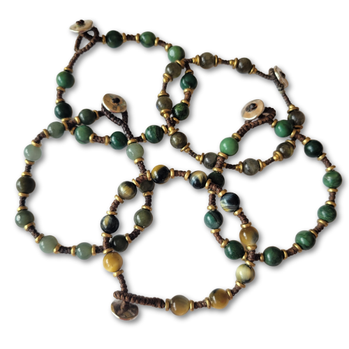 This bracelet provides a touch of class, with cool shades of gold and green. On a knotted cord of waxed cotton, marbleized globes are flanked by small metal disks.