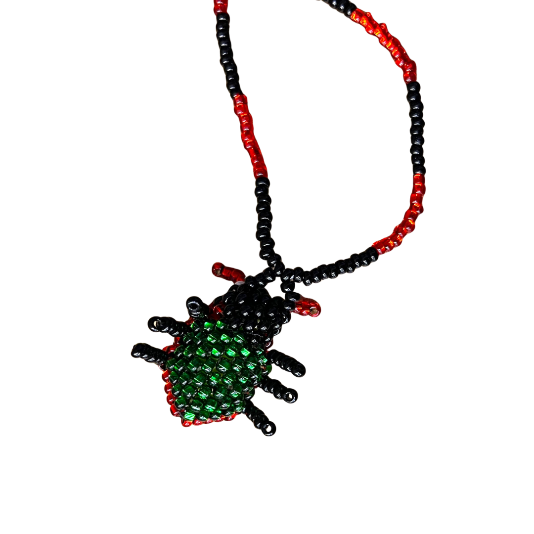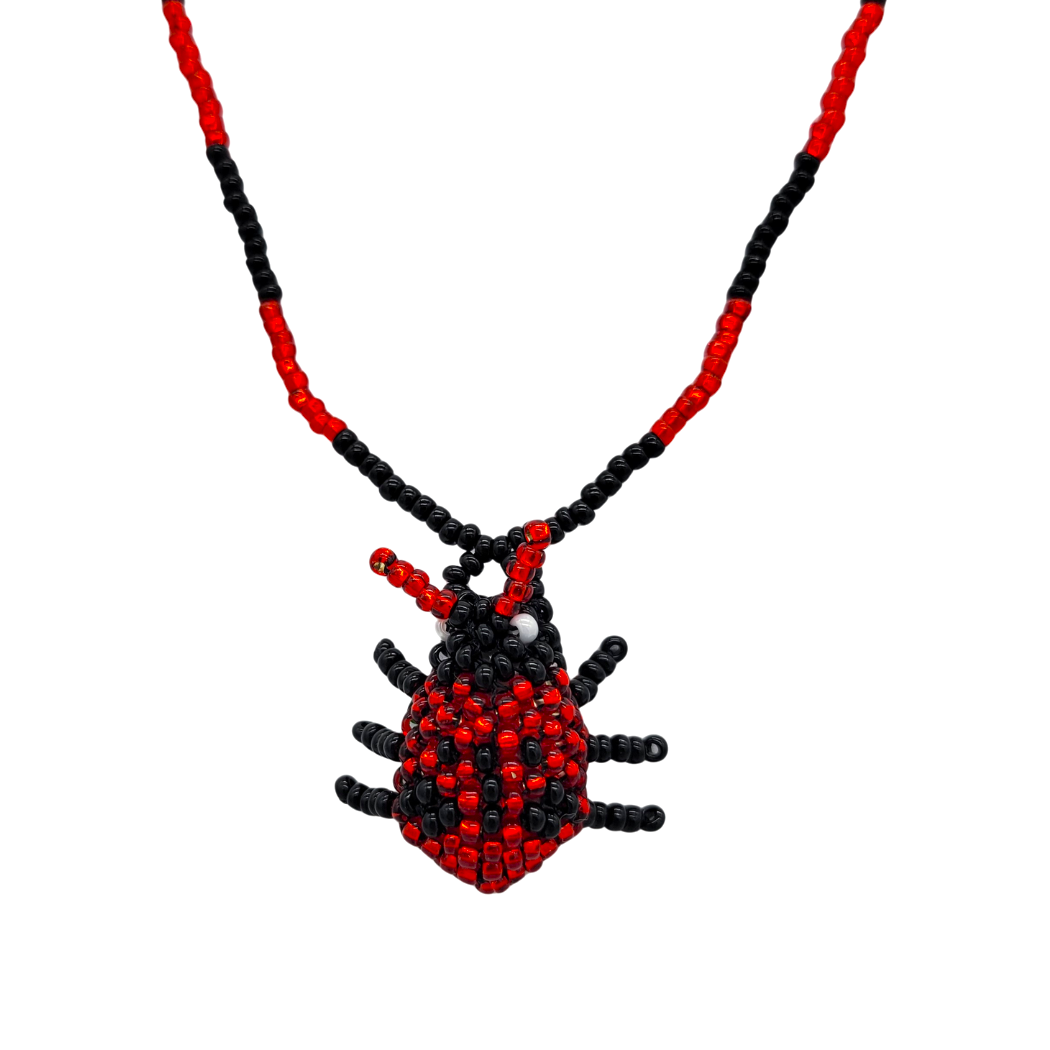 This charming necklace bears a glittering symbol of good luck: the ladybug. The pendant consists primarily of red and black seed beads, with two white beads for eyes and deep green beads on the belly.