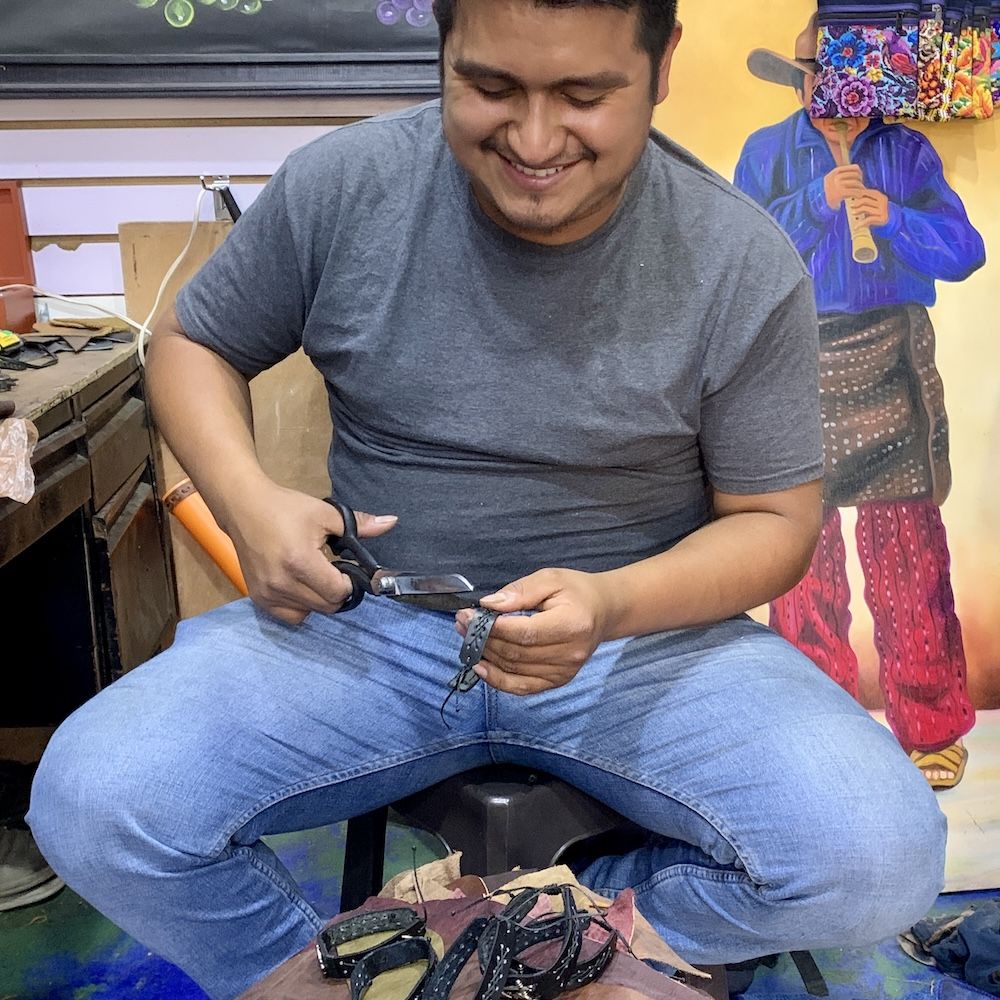 A ten-centavo coin from Guatemala draws the eye to this distinctive bracelet. It features a lightweight band of black leather, with designs made of waxed cotton cord.