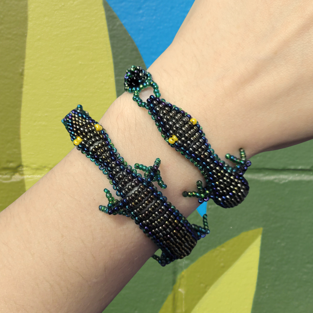 This sleek little lizard is one versatile creature. You can use it as a charm, adorning your favorite bag or backpack, or use it to carry your keys. You can even slide it off the metal keyring and turn it into a bracelet, thanks to an easily adjustable closure. Multicolored seed beads give the lizard an eye-catching iridescence.