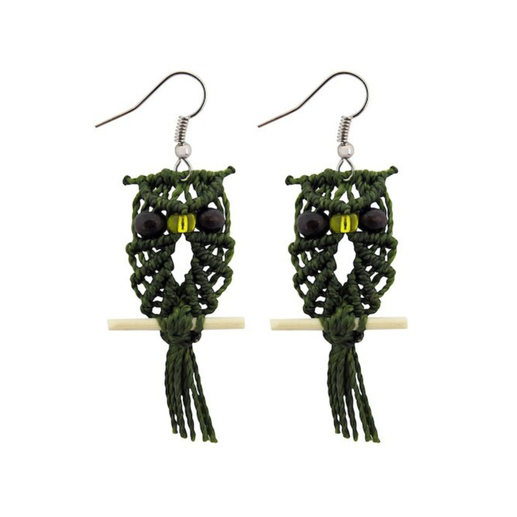 Who did we have in mind when we created these whimsical earrings? Basically, anyone who loves Nature -- or the night life! Each macrame owl has a glass bead for its beak and wooden beads for its eyes.
