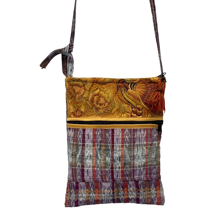 This medium-sized crossbody bag combines two types of repurposed fabric from Guatemala. The main body is colorful 100% cotton CORTE with metallic threads running through it, creating dynamic stripes that sparkle in the sunshine. A matching panel of handwoven 100% cotton HUIPIL at the top adds even more color and an extra touch of craftsmanship.