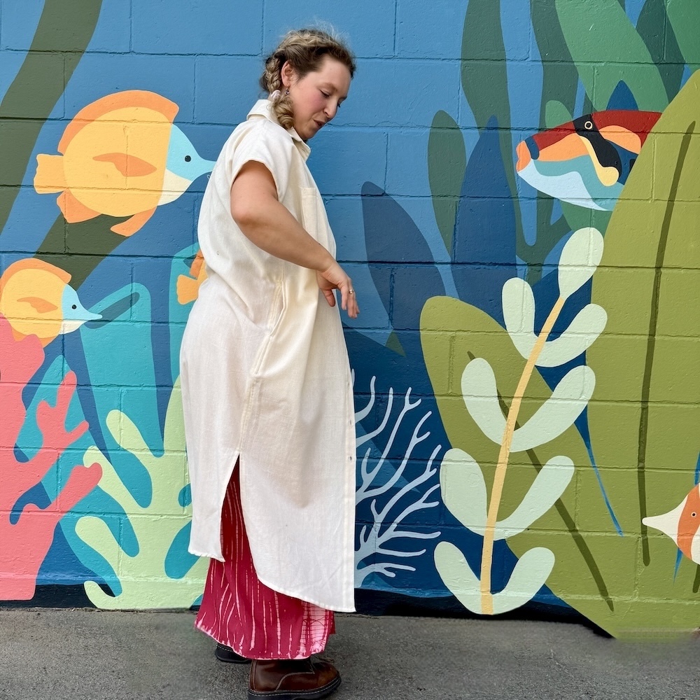 This versatile piece combines two looks, giving you a long profile in lightweight 100% cotton. Coconut shell buttons unify the shirt and dress aspects, which feature a chest pocket, two front pockets, and slits on either side.