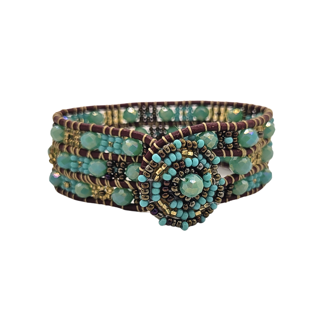 On this bold and colorful bracelet, even the closure catches the eye! Made primarily of seed beads and cotton cord, the bracelet comes in two styles: