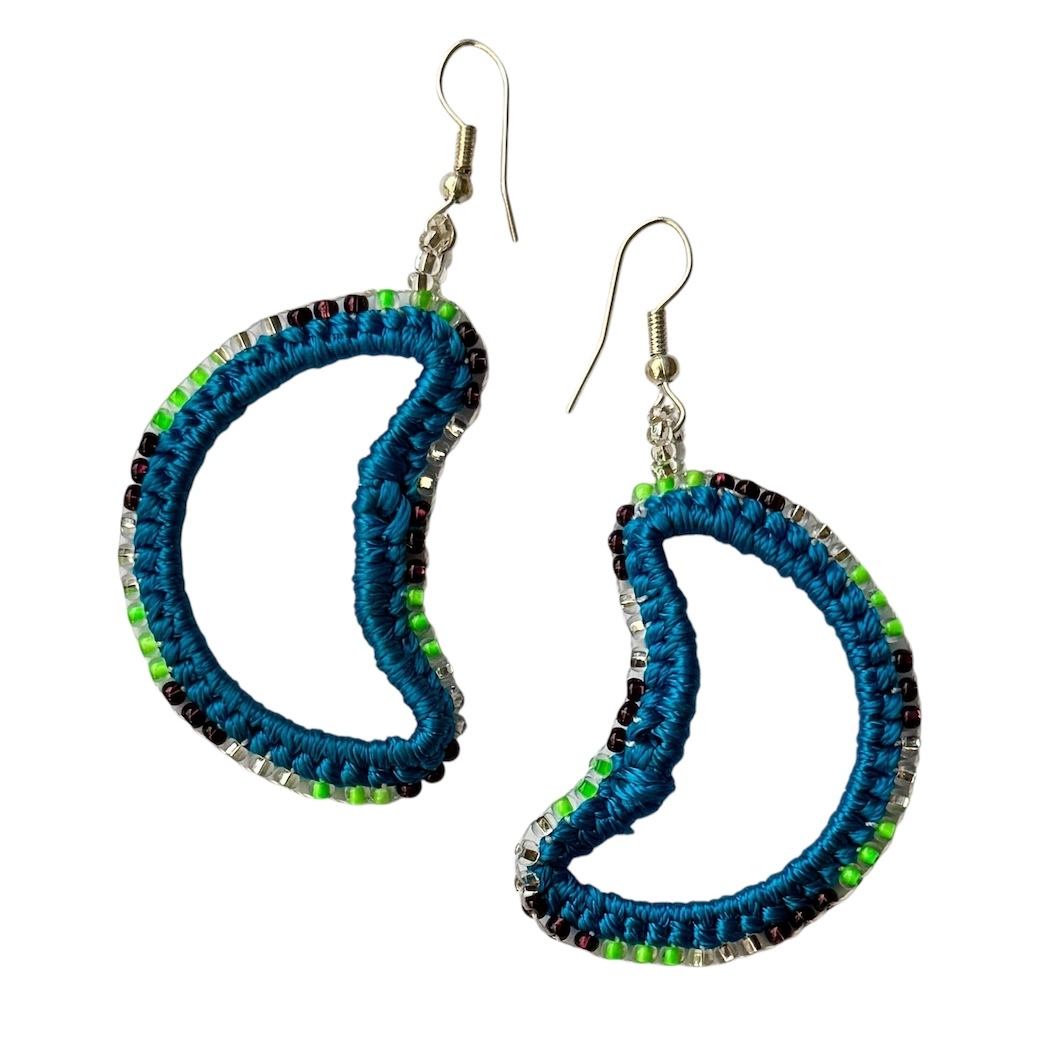 Like the moon itself, these beautiful earrings have a soft, subtle glow. It comes from a series of seed beads, lining a crescent of waxed cotton cord.