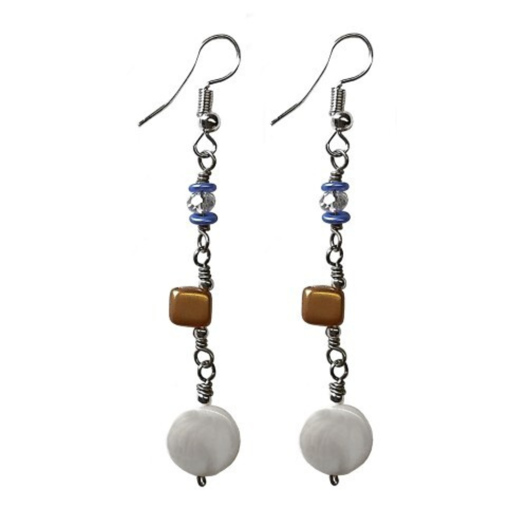 Mother of pearl beads are the stars of these long single-strand beauties, but the supporting players are eye-catching, too: smooth ceramic bricks, ceramic donut-shaped beads, and sparkling crystal beads.